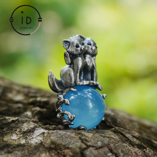 Fox Totem Pendant with Aquamarine, Fantasy Animal Amulet Necklace, Handcrafted Spirit Jewelry, Twin Guardian Design