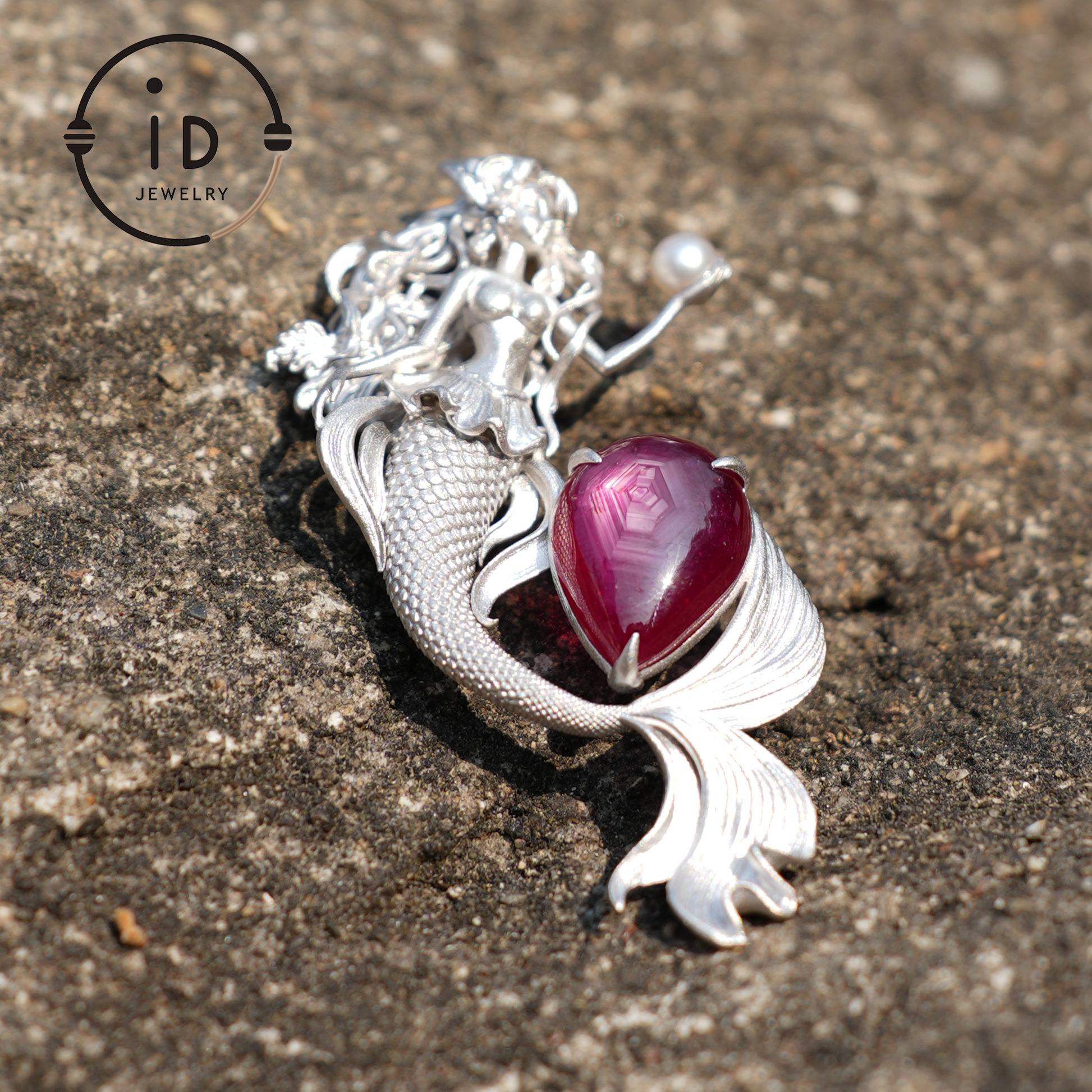 925 Sterling Silver Mermaid Star-Ruby Pendant Necklace | Hand-Carved Wave-Tail | Fantasy Ocean Talisman of Love & Protection