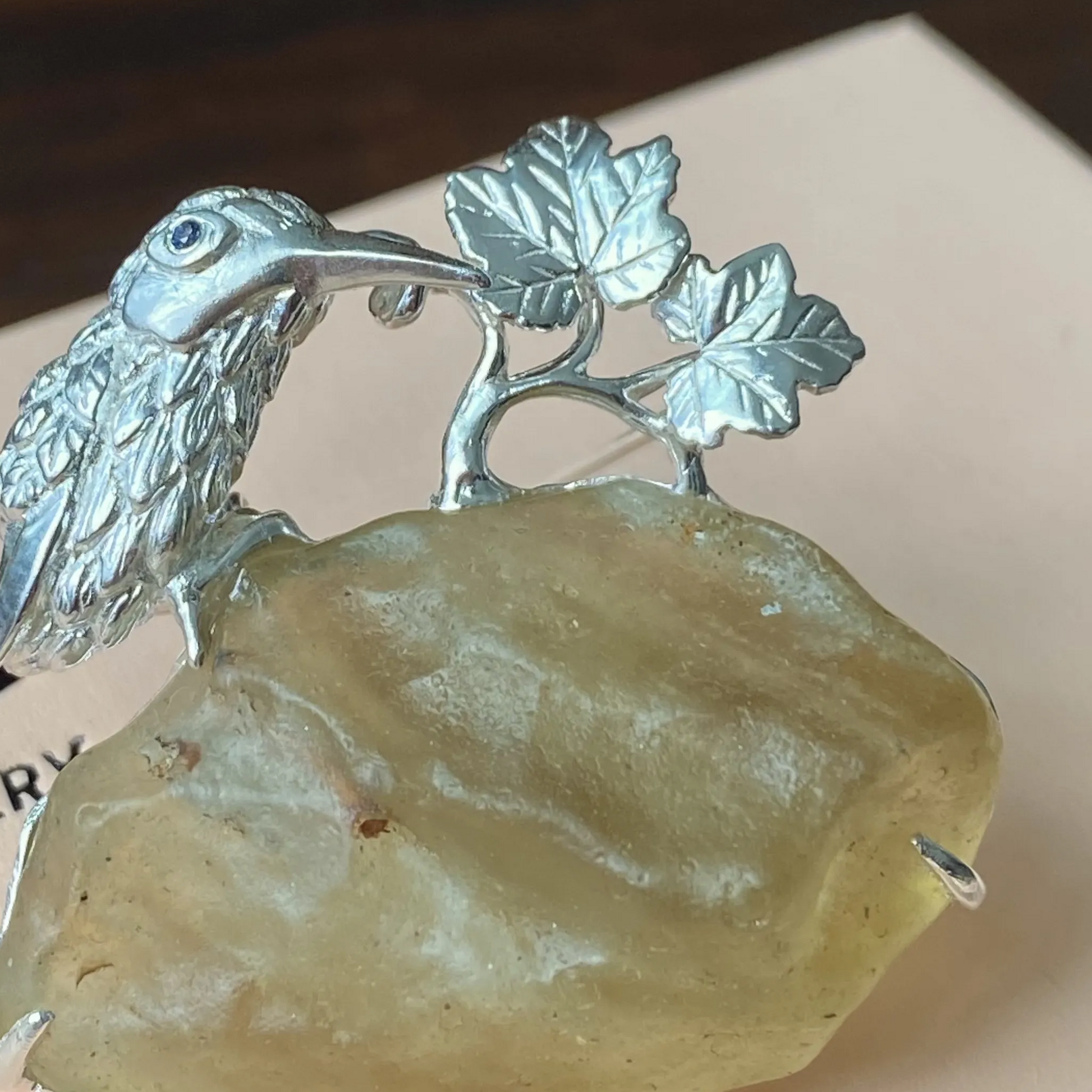 This handcrafted Bird Brooch Pendant features a finely detailed 925 sterling silver bird perched on a raw meteorite glass base, with a delicate leaf in its beak symbolizing hope and renewal.