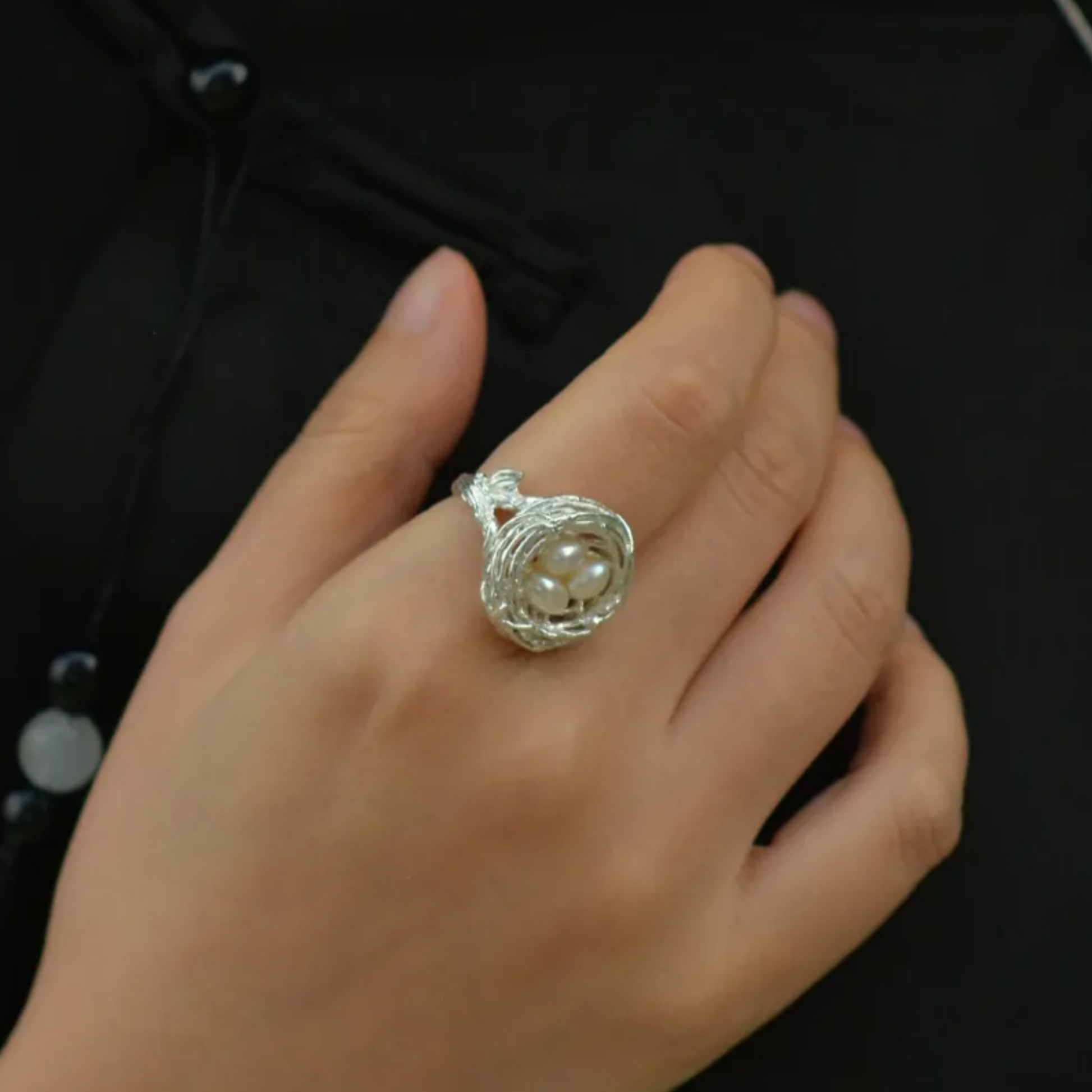 925 Silver Bird Nest Ring | Pearl Nature Jewelry | Handmade Branch Design | Symbol of Home & Love | Gift for Mother or Partner
