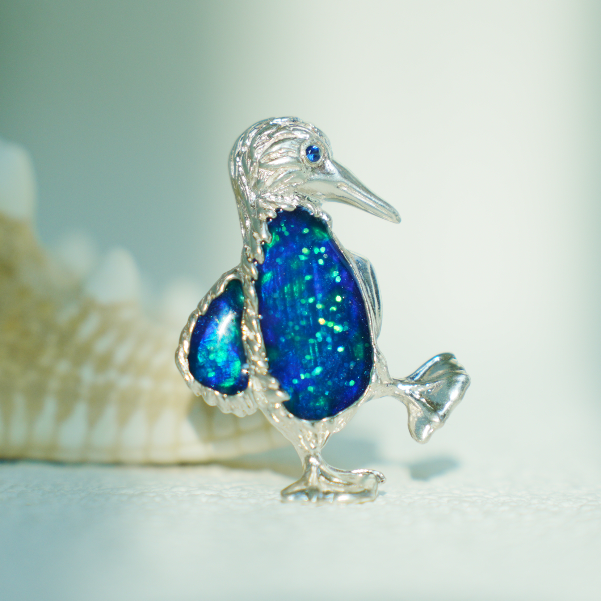 Inspired by the playful blue-footed booby bird, this piece features a sculpted 925 sterling silver body with hand-painted enamel wings and a sapphire eye that sparkles with curiosity.