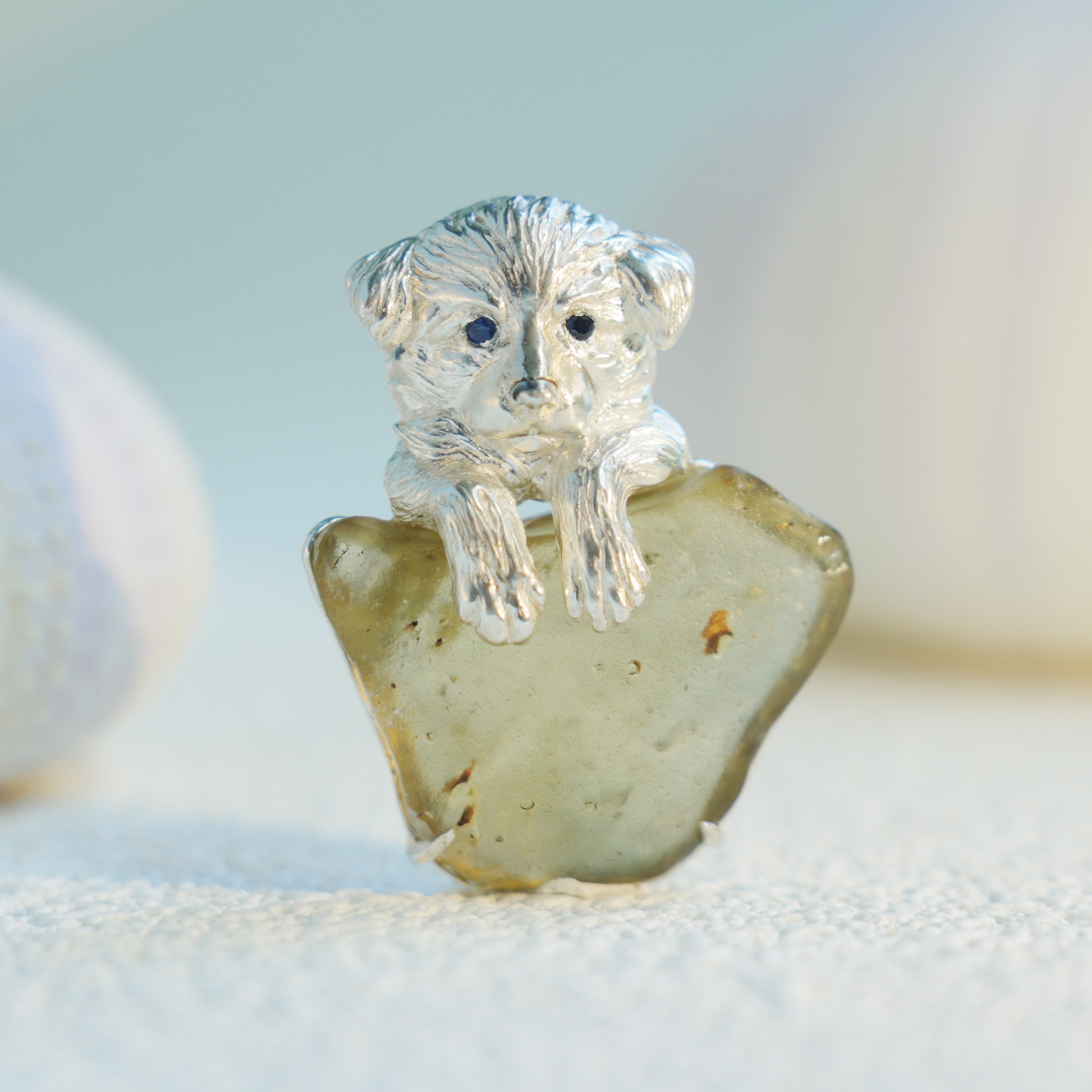 This tender piece features a resting dog sculpted from 925 sterling silver, lovingly leaning over a piece of Libyan Desert Glass, one of the world’s rarest natural tektites formed by ancient meteorite impact.