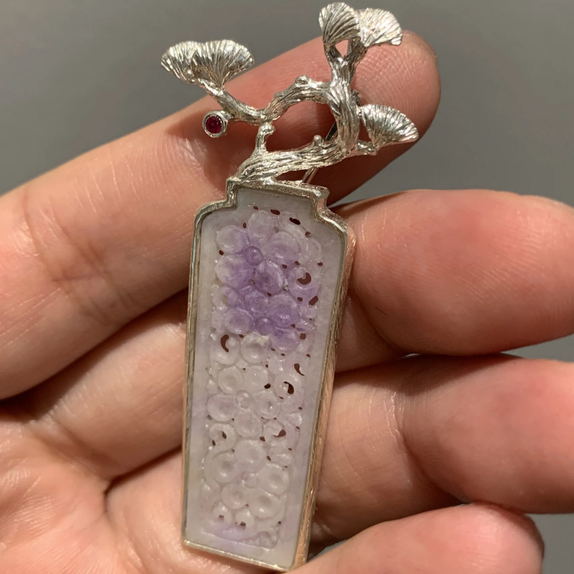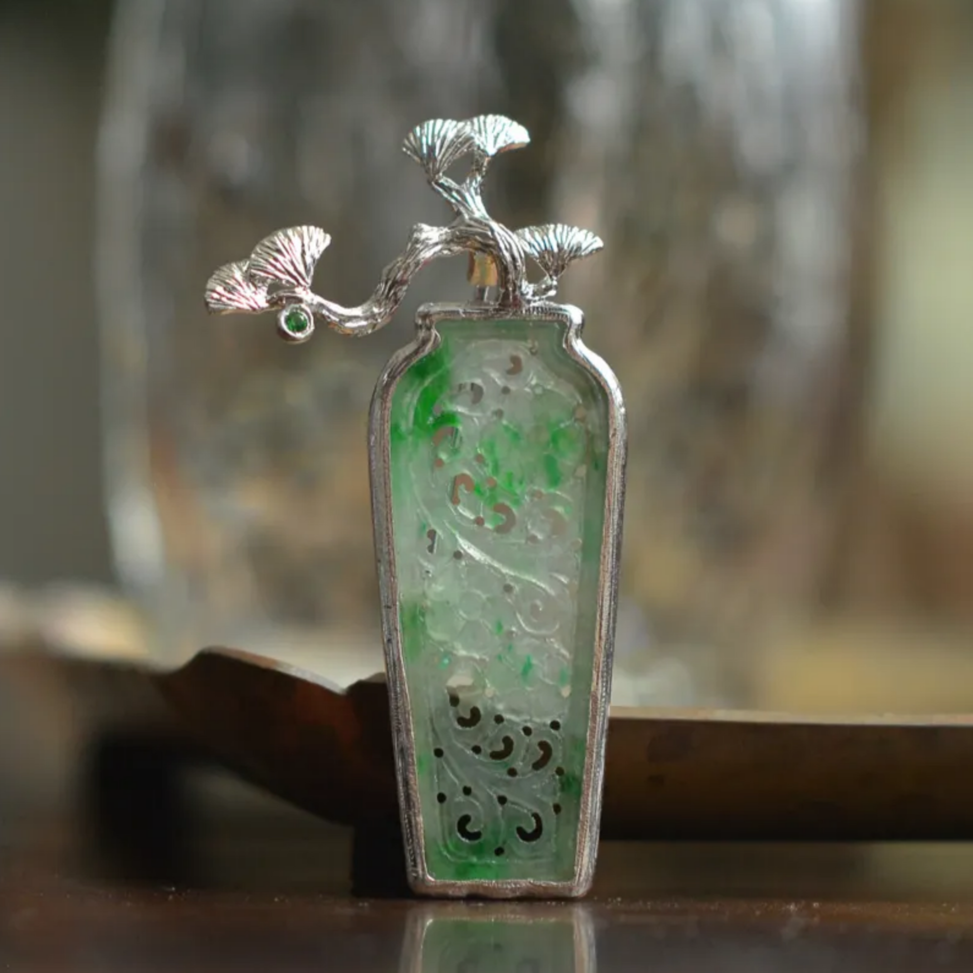 Carved in 925 sterling silver, the delicate pine branch extends gracefully from a soft green jade vessel, blending craftsmanship and cultural depth. It is both wearable art and a talisman for serenity and strength.