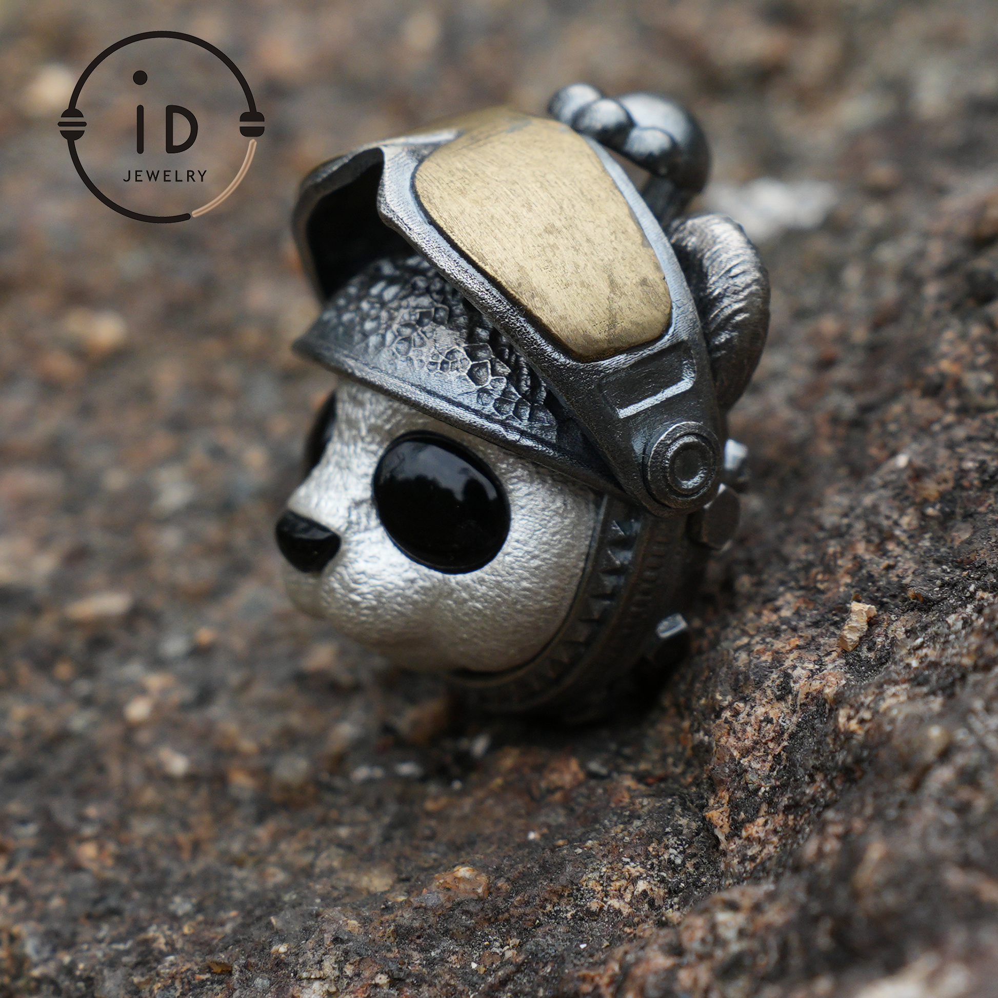 Armored Adventure Panda Pendant · 925 Silver + Brass + Onyx · Movable Sunglasses Design · Whimsical Guardian Totem