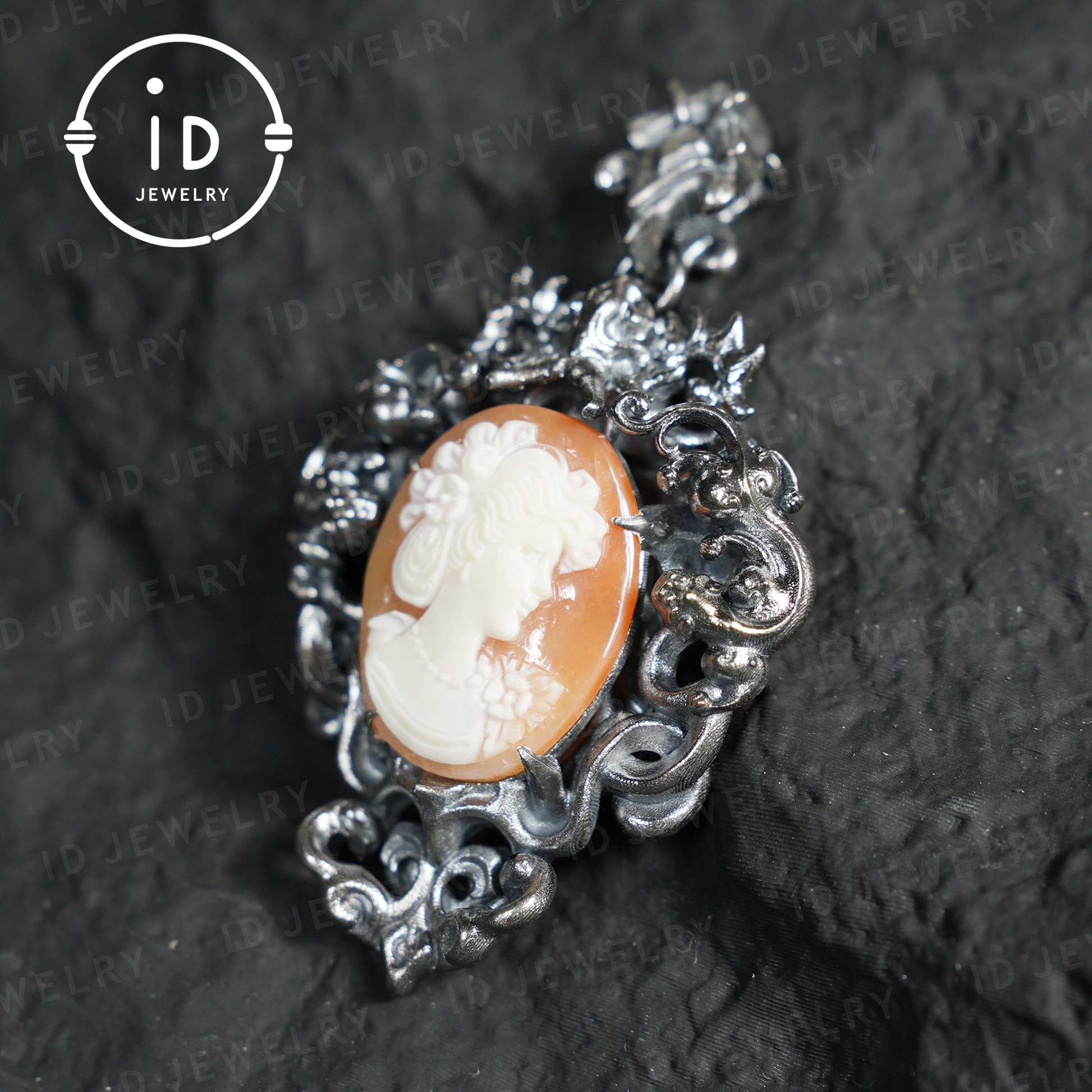 featuring ornate vintage engravings and a genuine shell-carved cameo.