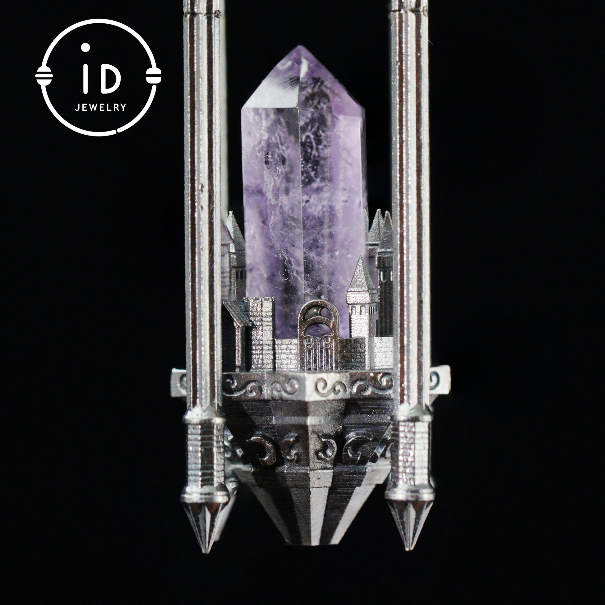 At its heart lies a natural amethyst, symbolizing tranquility and insight, securely embraced by four finely crafted silver pillars.