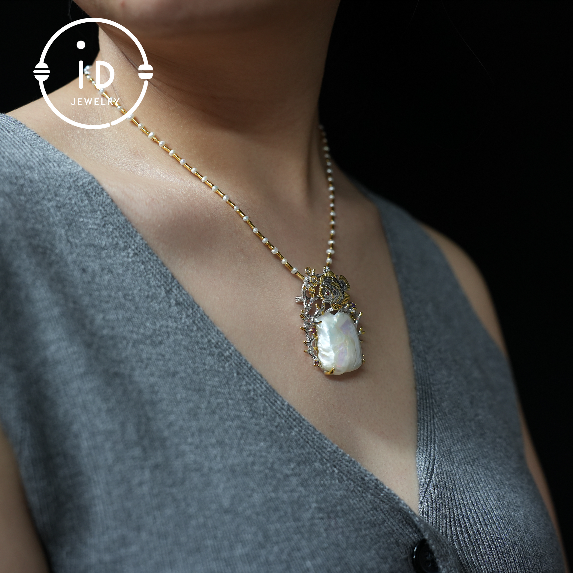 Dive into an ocean of elegance with this unique brooch and pendant combo. The goldfish symbolizes luck and prosperity, complemented by the natural beauty of a baroque freshwater pearl.