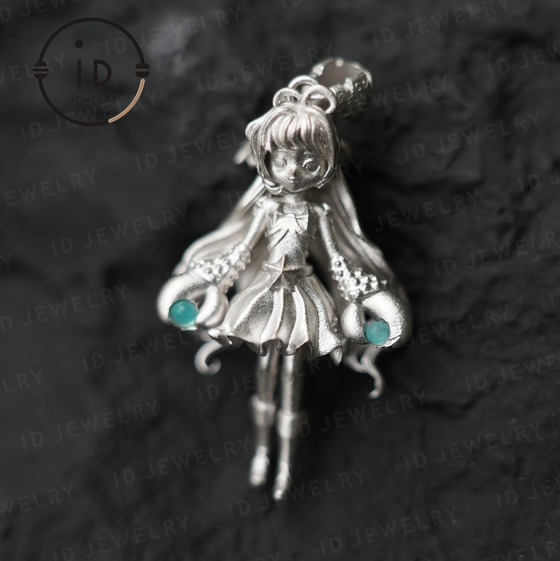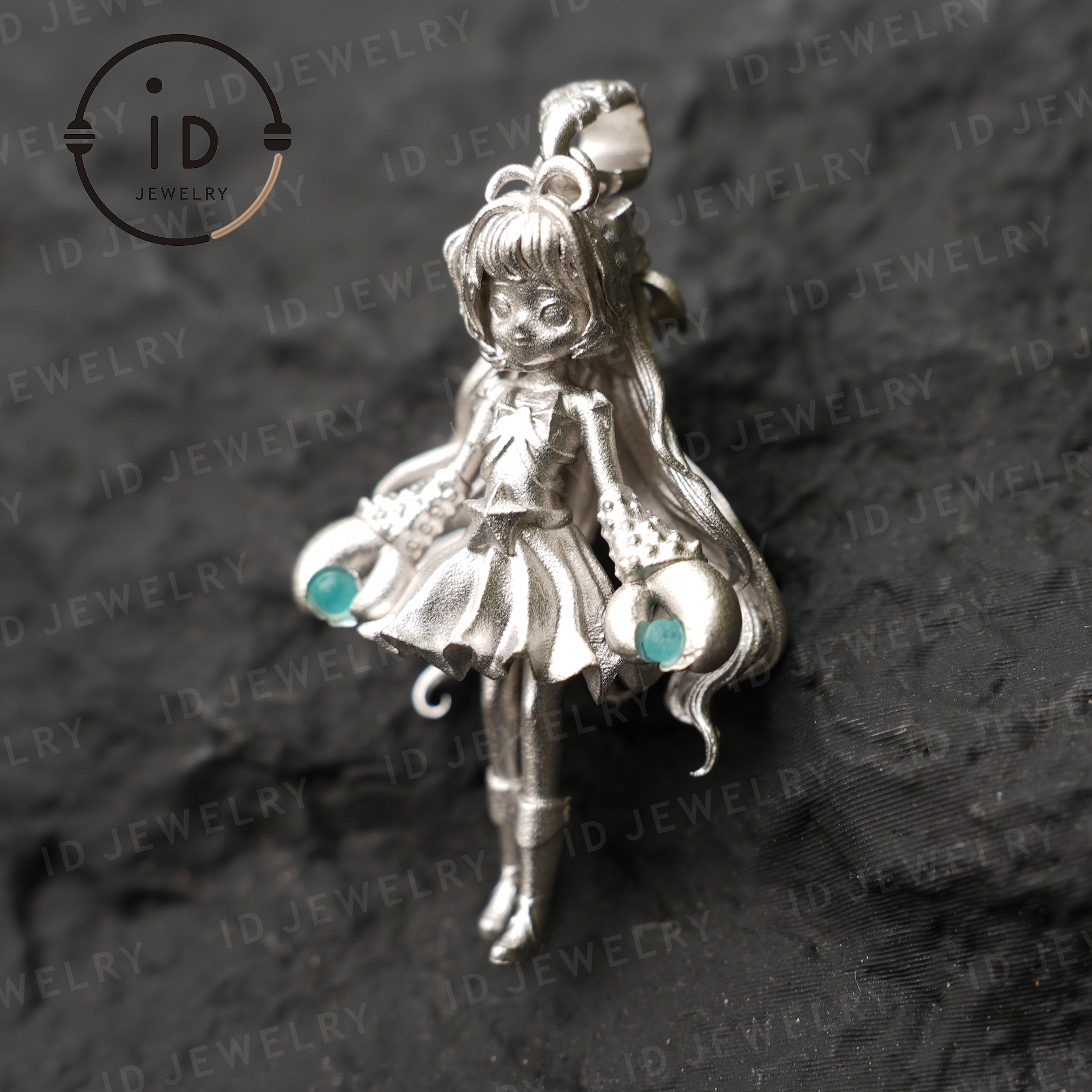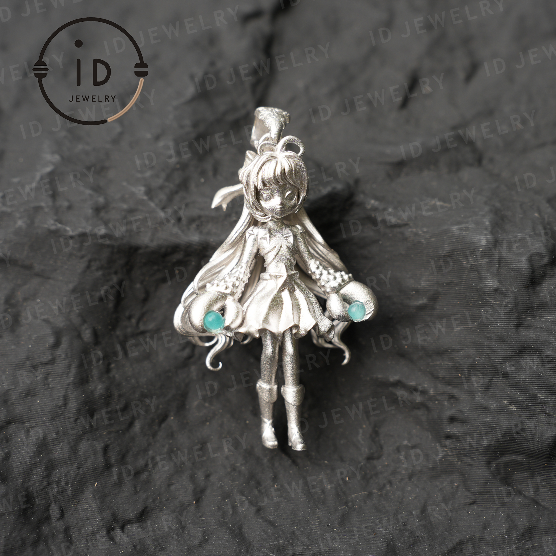 This pendant is finely crafted in 925 silver, featuring a girl with a rippling skirt and flowing hair. Her arms bear two crab claw-shaped guards inset with natural amazonite, echoing the sea’s call — both a symbol of emotion and a battle stance. Her silhouette rises like gentle waves, tender yet sharp and unyielding.