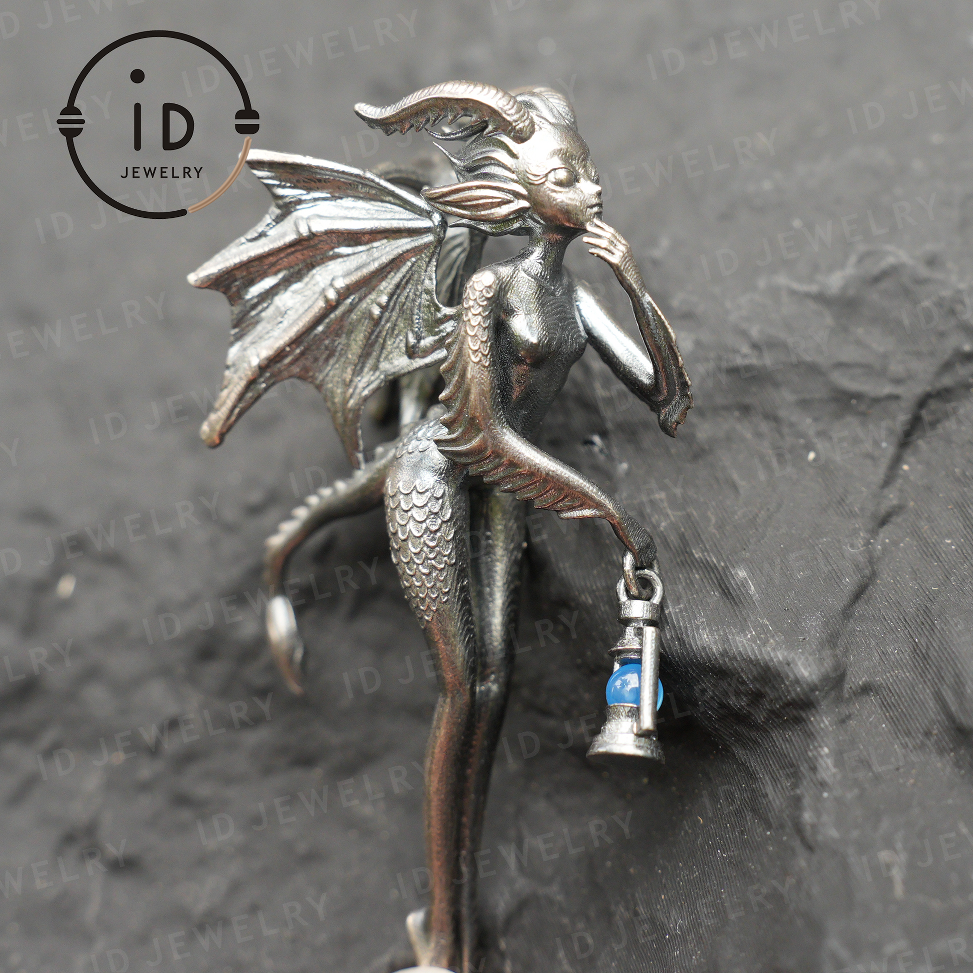 Dragon Girl Holding Lantern | Dragon-Themed Pendant in Hand-Carved Silver | A Fantasy Necklace for Your Inner Journey