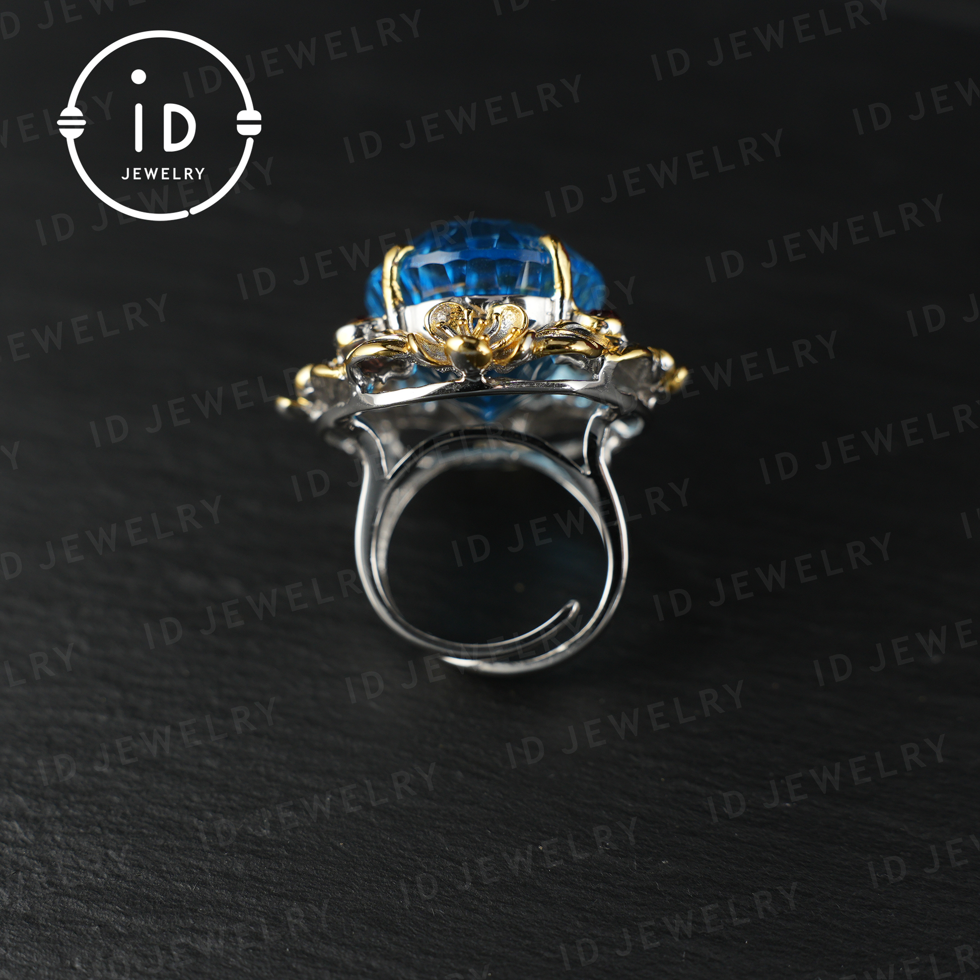 ✨ A truly regal masterpiece! This handcrafted baroque ring combines luxurious elegance with exquisite design. A large, dazzling natural topaz set in 925 silver with 18K gold-plated floral details makes this a standout statement piece.
