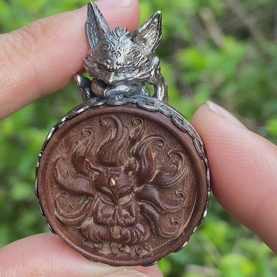 This artistically crafted pendant made of silver and agarwood combines fine craftsmanship, symbolic imagery, and spiritual meaning. The seated fox with closed eyes – carefully carved in dark wood – rests on a frame of oxidized 925 sterling silver. Worn as a spiritual necklace, this totemic piece represents introspection, awareness, and transformation. A meaningful gift for birthdays or for anyone deeply connected to self and nature.
