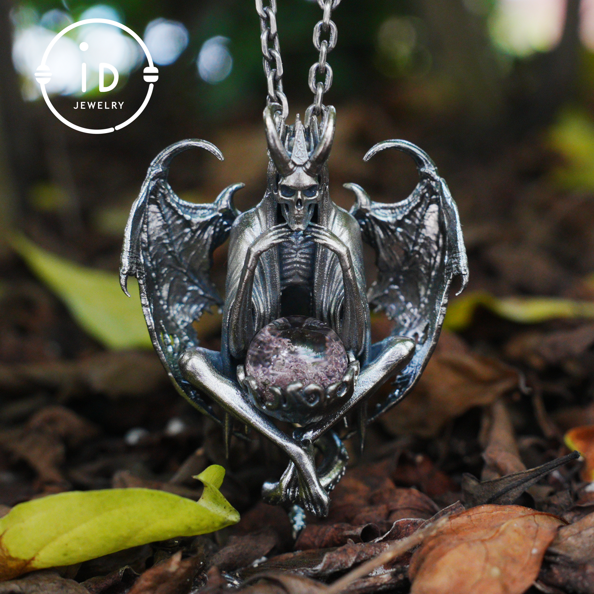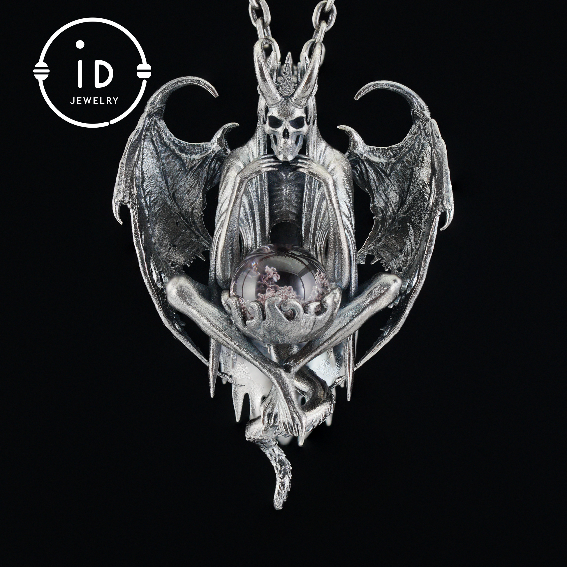 This handmade gothic pendant in oxidized 925 silver unites symbolism and craftsmanship. The centered ghost crystal reflects inner clarity, while the sculpted figure in silent posture acts as a bearer of balance and awareness. As a talisman, it supports introspection and mindful presence.