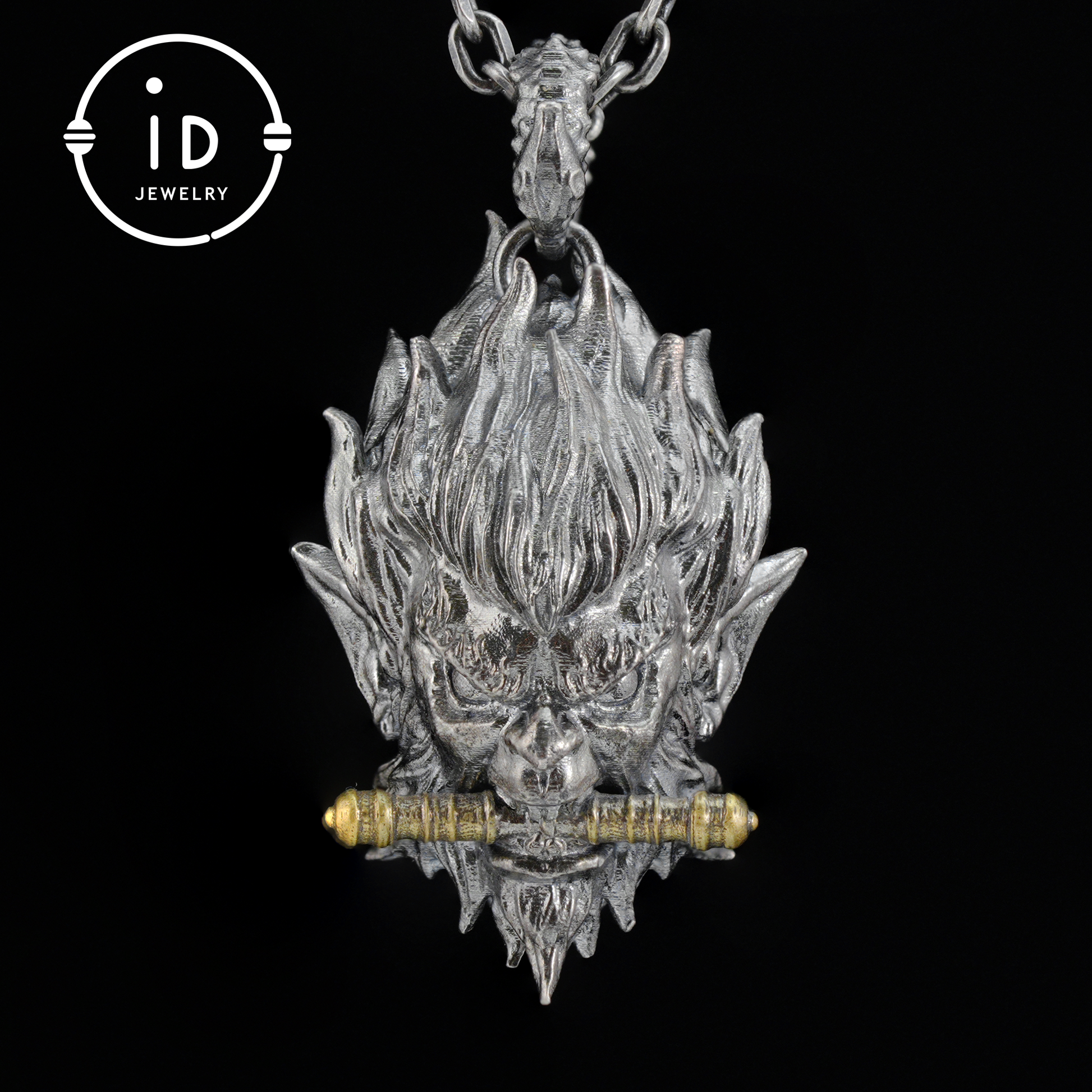 The flaming hair symbolizes untamed energy, the sword in the mouth stands for self-discipline, and the oxidized finish for lived experience.