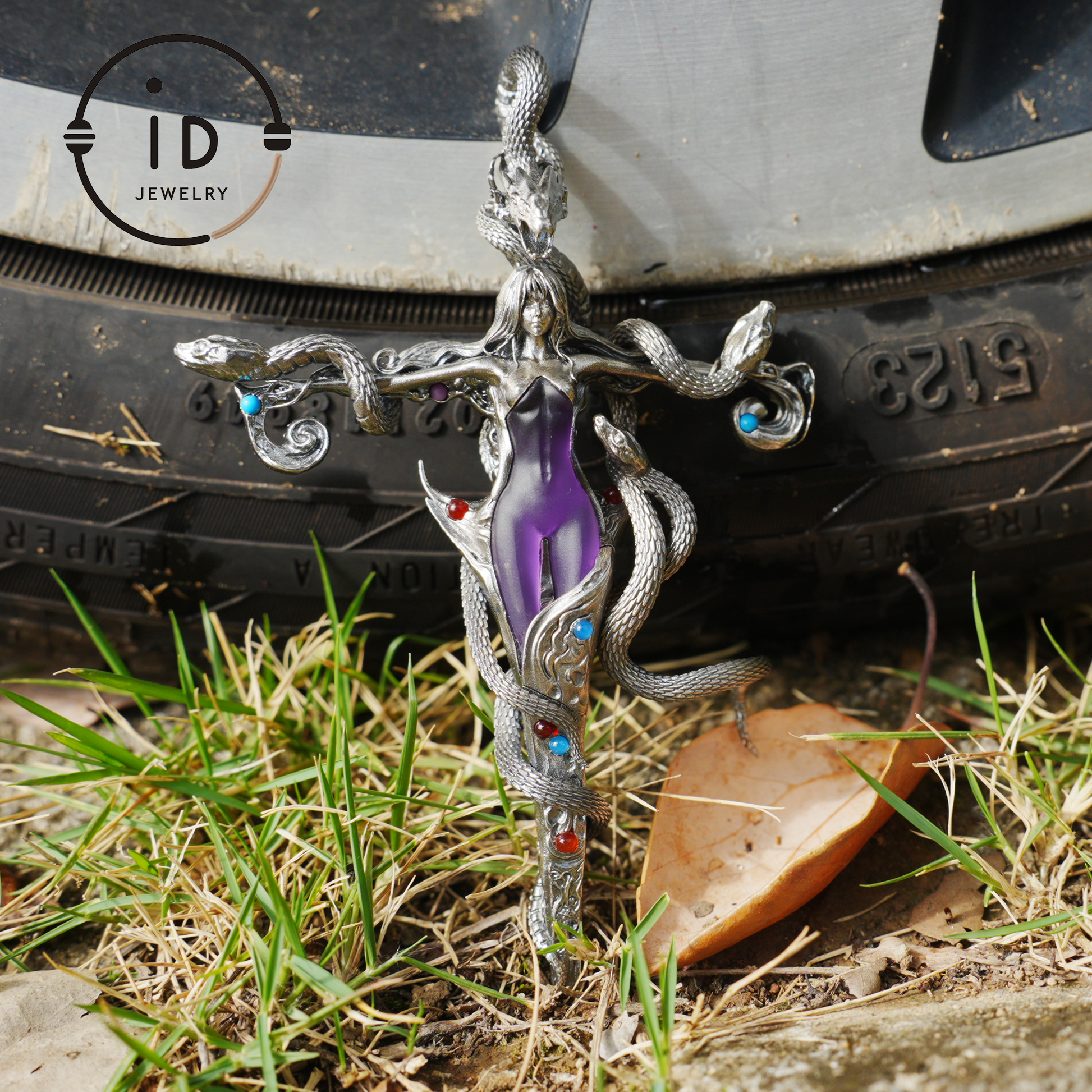 This mystical pendant in 925 sterling silver merges the mysterious elegance of the serpent with the subtle shimmer of amethyst and colored glass accents. The feminine silhouette intertwined with snakes symbolizes the eternal dance of strength and surrender, shadow and clarity.