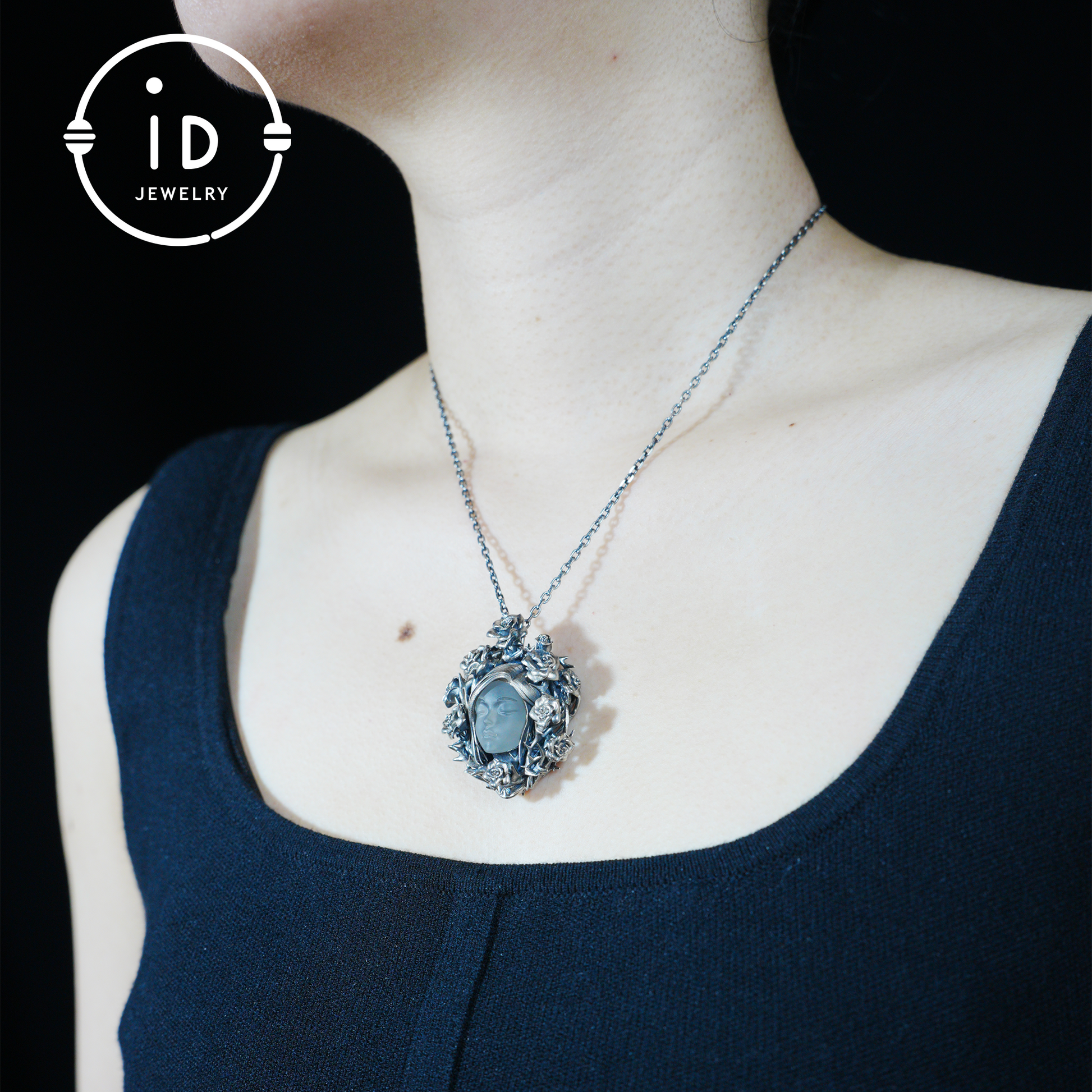 She closes her eyes and drifts to sleep inside a wreath of blooming roses. The wind stills and sounds slow down; all the bustle is kept outside by petals and thorns. The clear white crystal carves the girl’s face like a gently guarded heart; silver roses encircle her, creating a private place of calm. Wear it as a reminder: even amid busyness, give your soul a flower and a quiet moment.