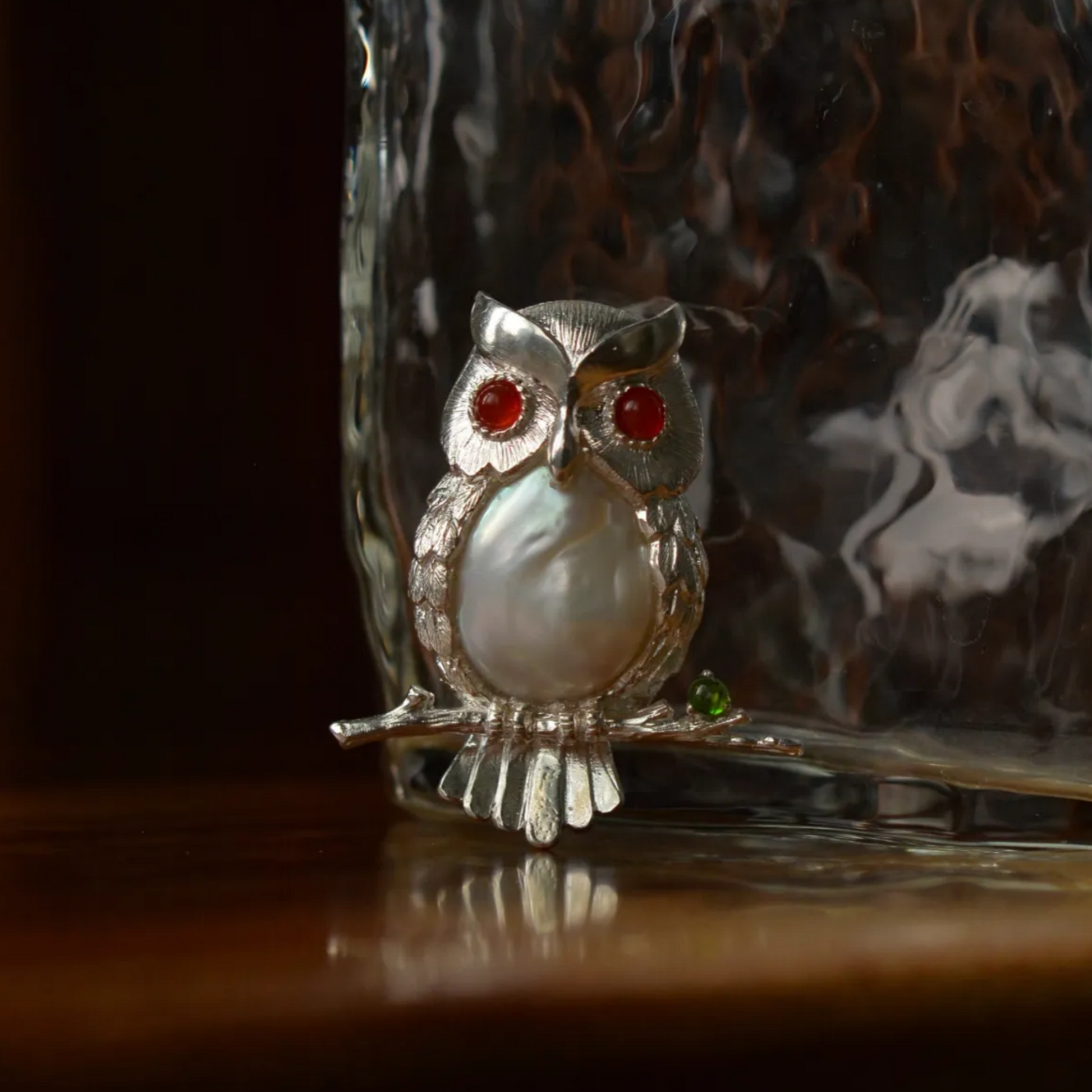 A refined handcrafted owl brooch pendant made from 925 sterling silver, combining the purity of a natural freshwater pearl, the warmth of carnelian eyes, and the gentle green glow of diopside on its branch.