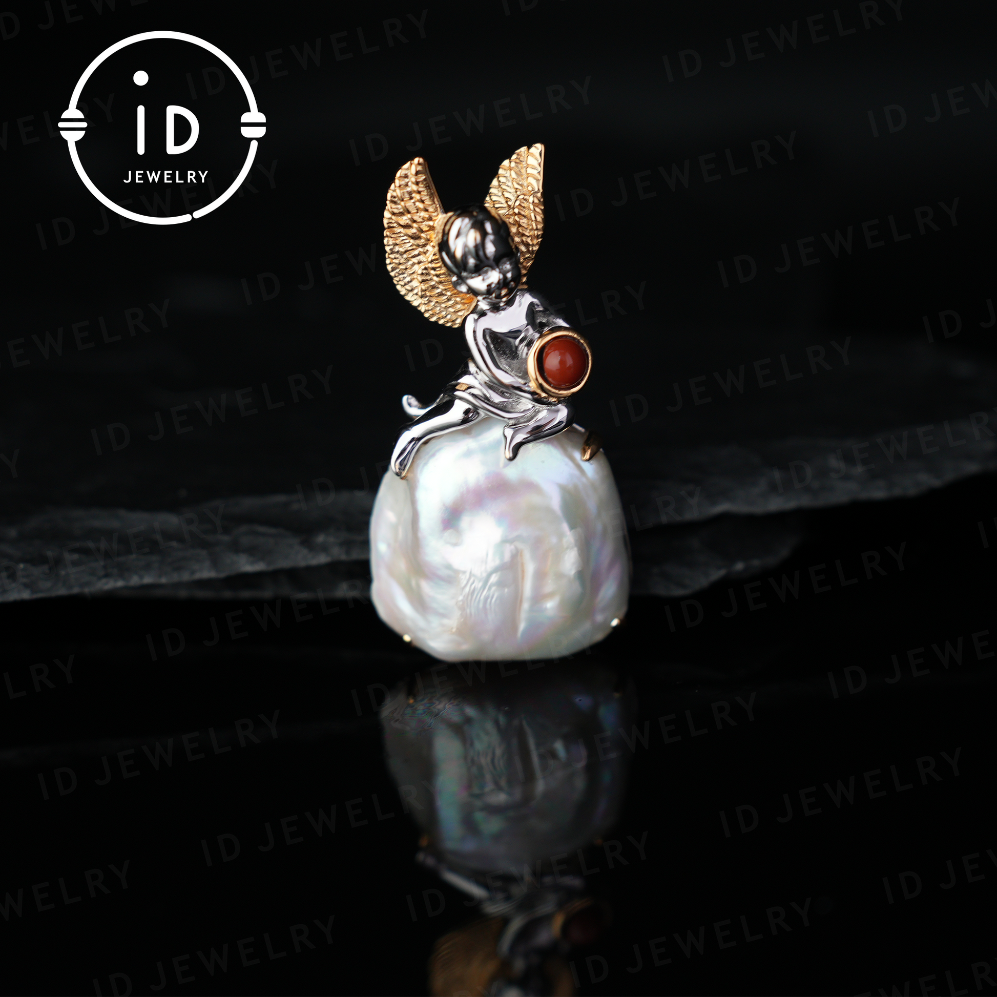 Handmade Angel Pendant | Baroque Pearl Jewelry with Carnelian | Amulet Gift | Fantasy Art Jewelry