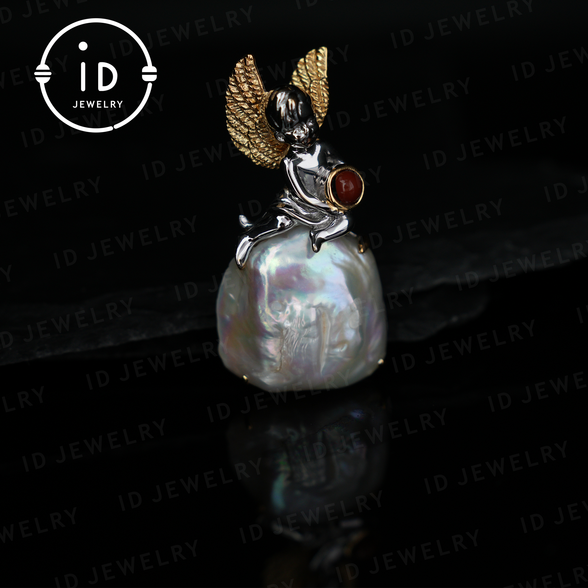 This pendant combines a natural baroque pearl with a red carnelian. The angel is made of 925 silver and decorated with 18K gold - a true treasure of art.