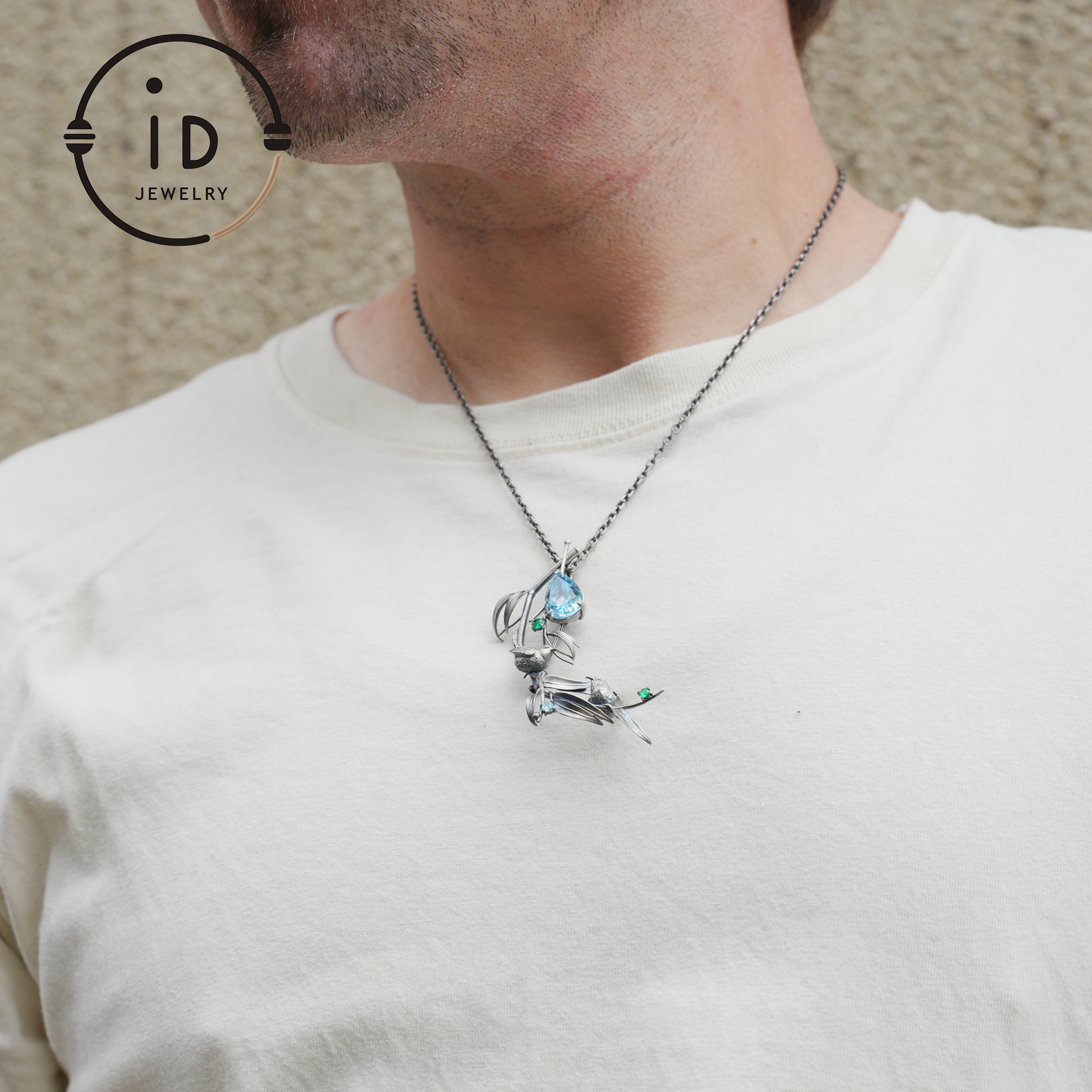 Handmade Brooch & Pendant with Blue Topaz, Green Gemstone, Oxidized 925 Silver, Nature-Inspired Fairy Jewelry, Gift for Her