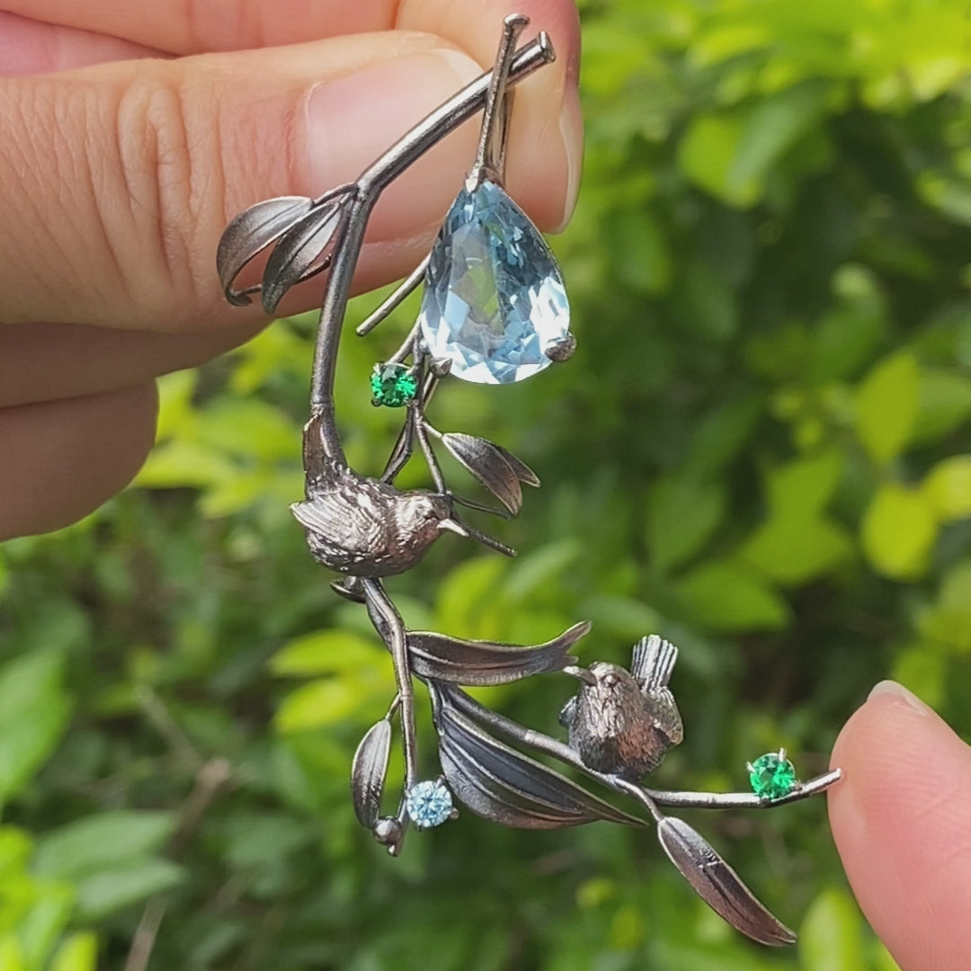This unique piece was designed to capture a moment of stillness – a quiet connection between human and nature. The handmade pendant & brooch features delicate bird motifs with fine branches, all set in oxidized silver. The sparkling blue topaz and green gemstones add a calm, clear energy to the piece – ideal as a talisman for mindfulness, harmony, and inner balance.
