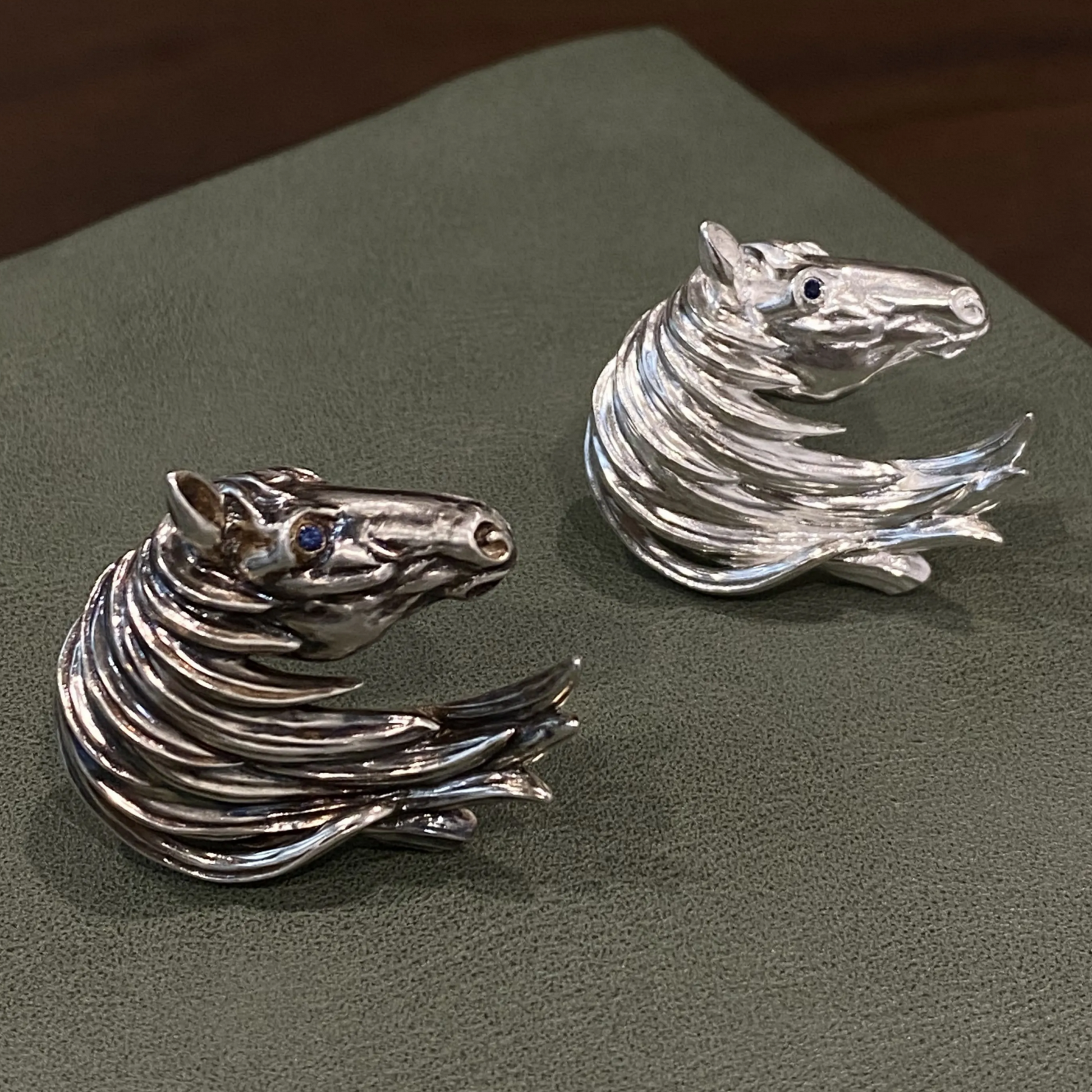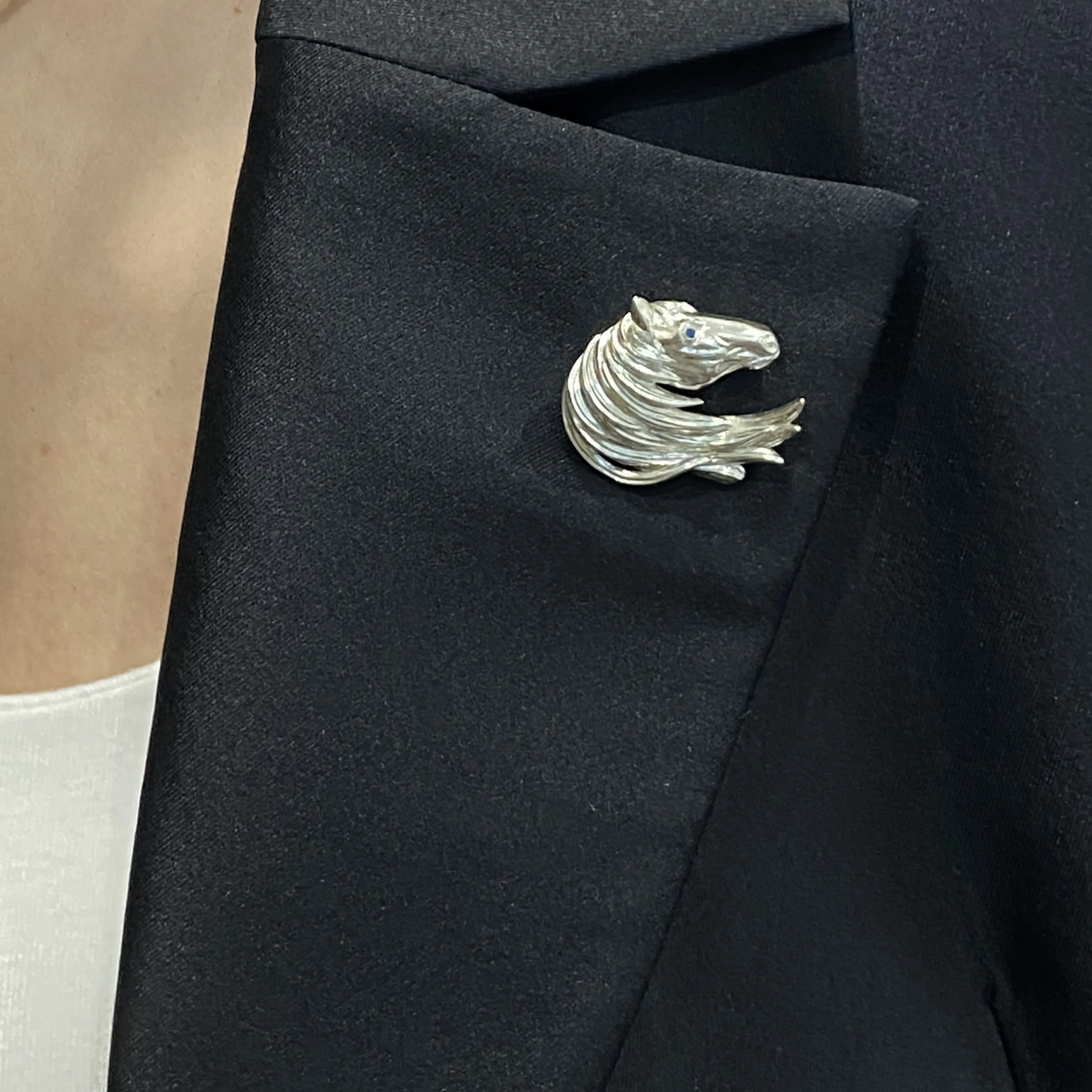 This Horse Brooch Pendant is meticulously handcrafted in 925 sterling silver, set with a blue sapphire eye that brings depth and spirit to the design.