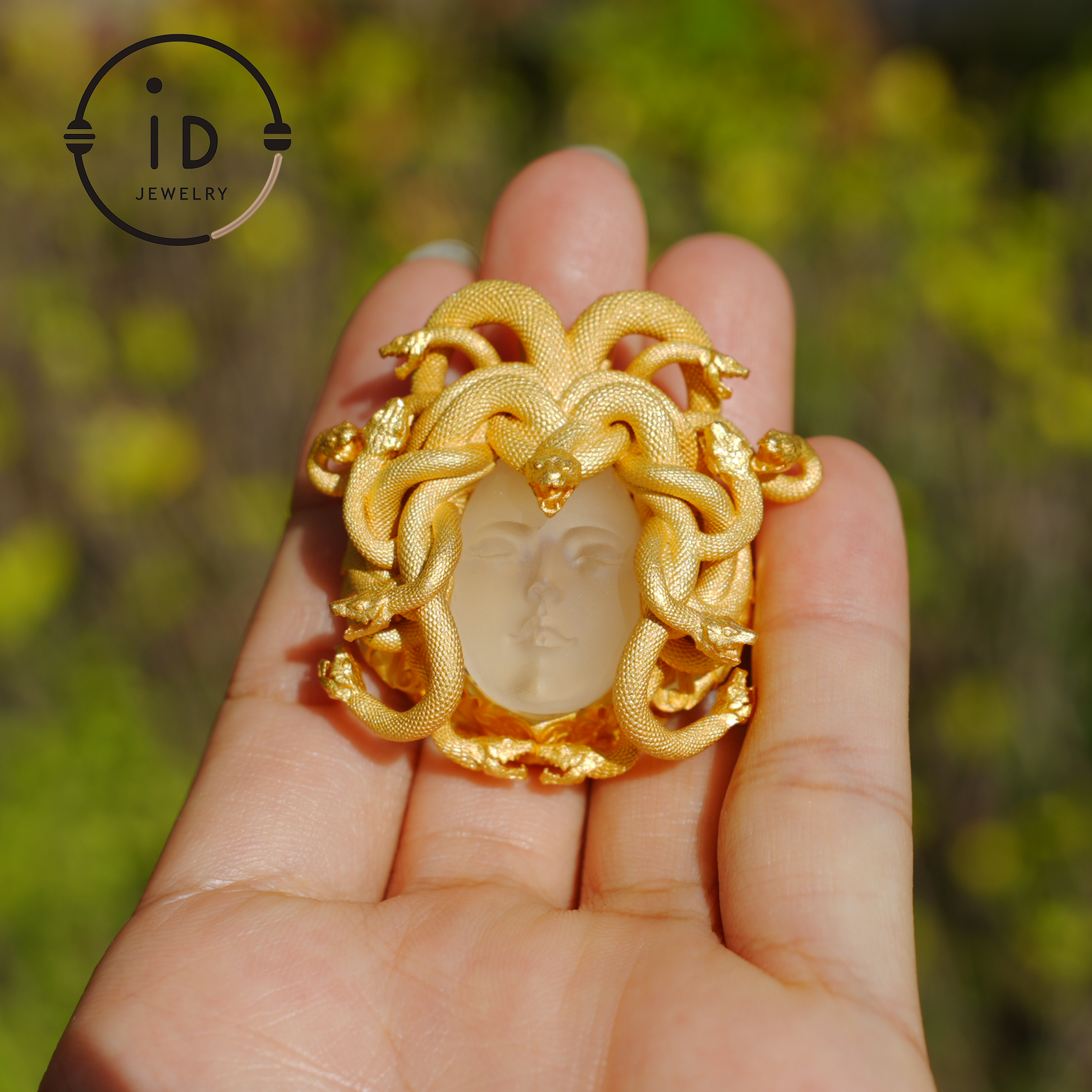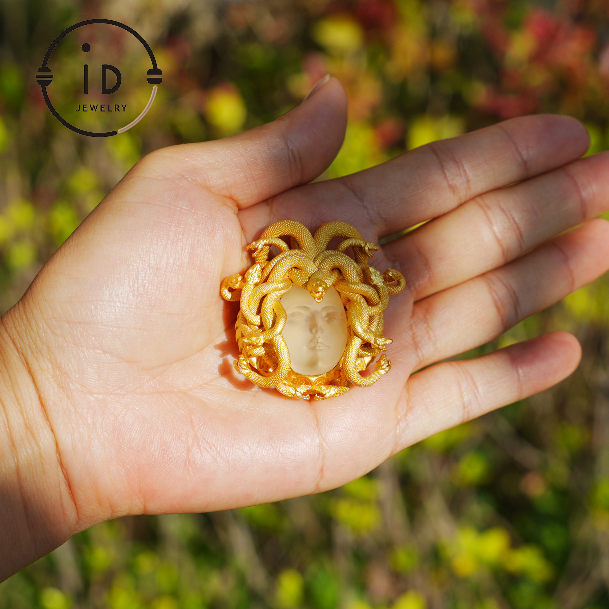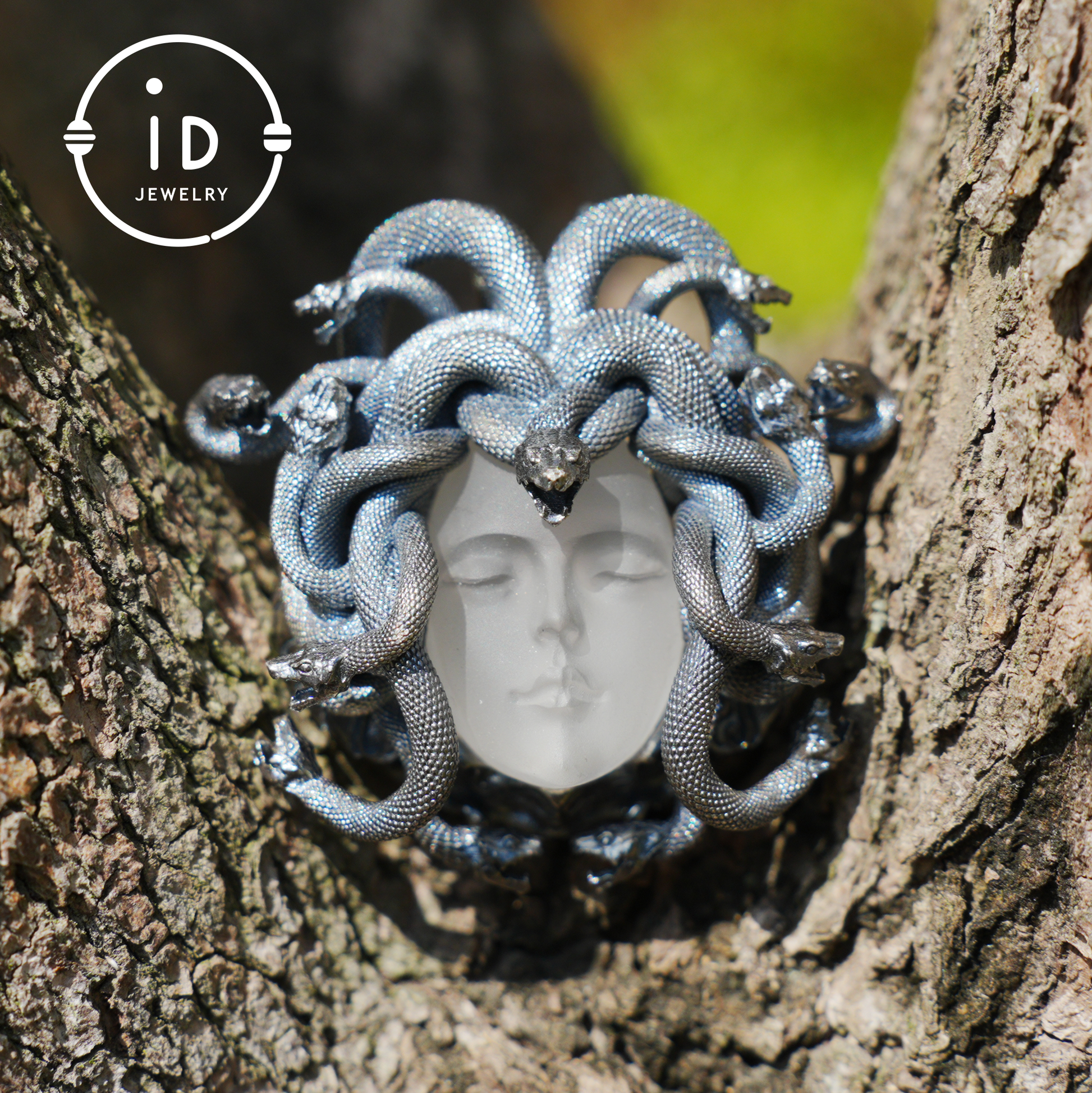Step into the world of mythology with this stunning handcrafted Medusa Pendant, featuring an intricate 925 sterling silver design with a mesmerizing hand-carved white crystal. Inspired by the legendary Gorgon, this pendant captures the mystique and elegance of Medusa in breathtaking detail.