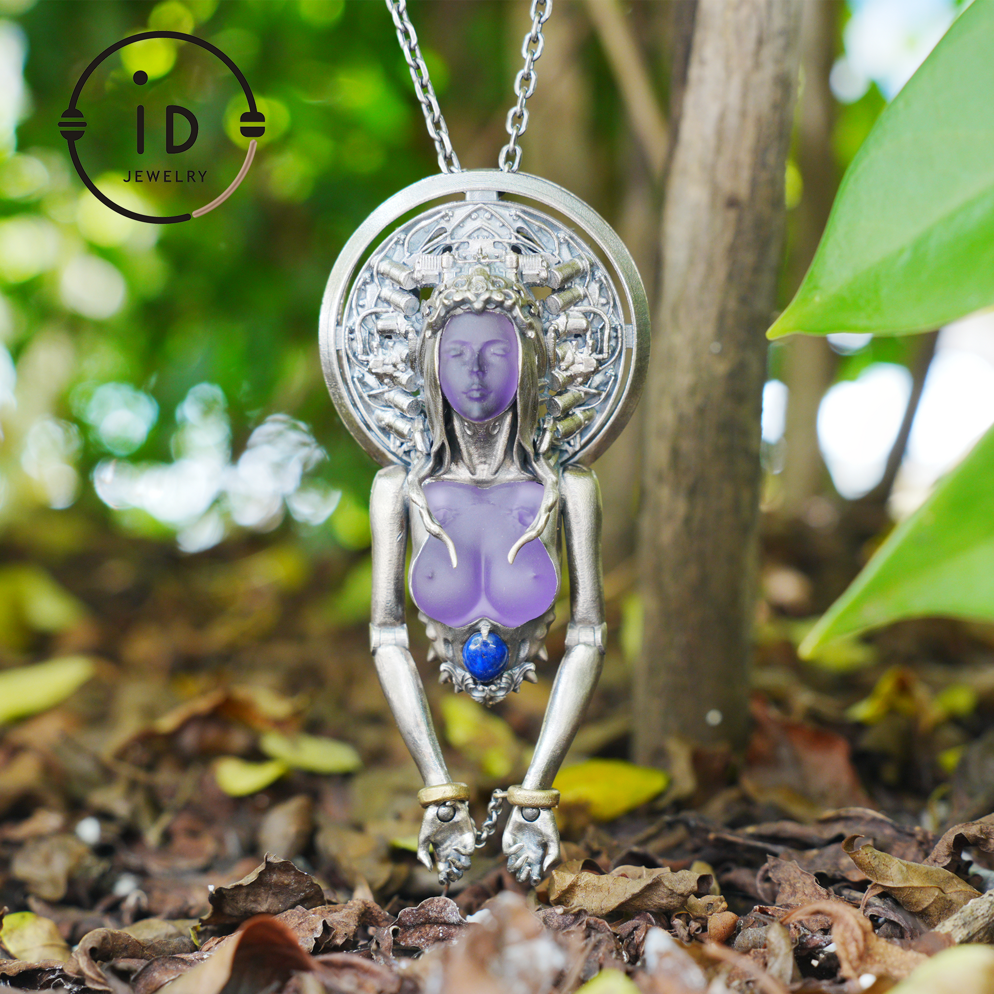 🐉 Cyber Goddess Amulet — Handmade 925 Silver & Carved Crystal Statement
