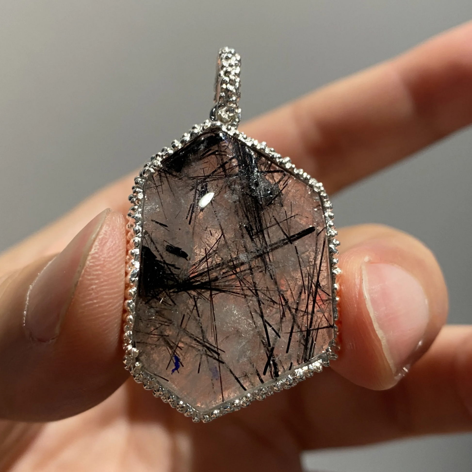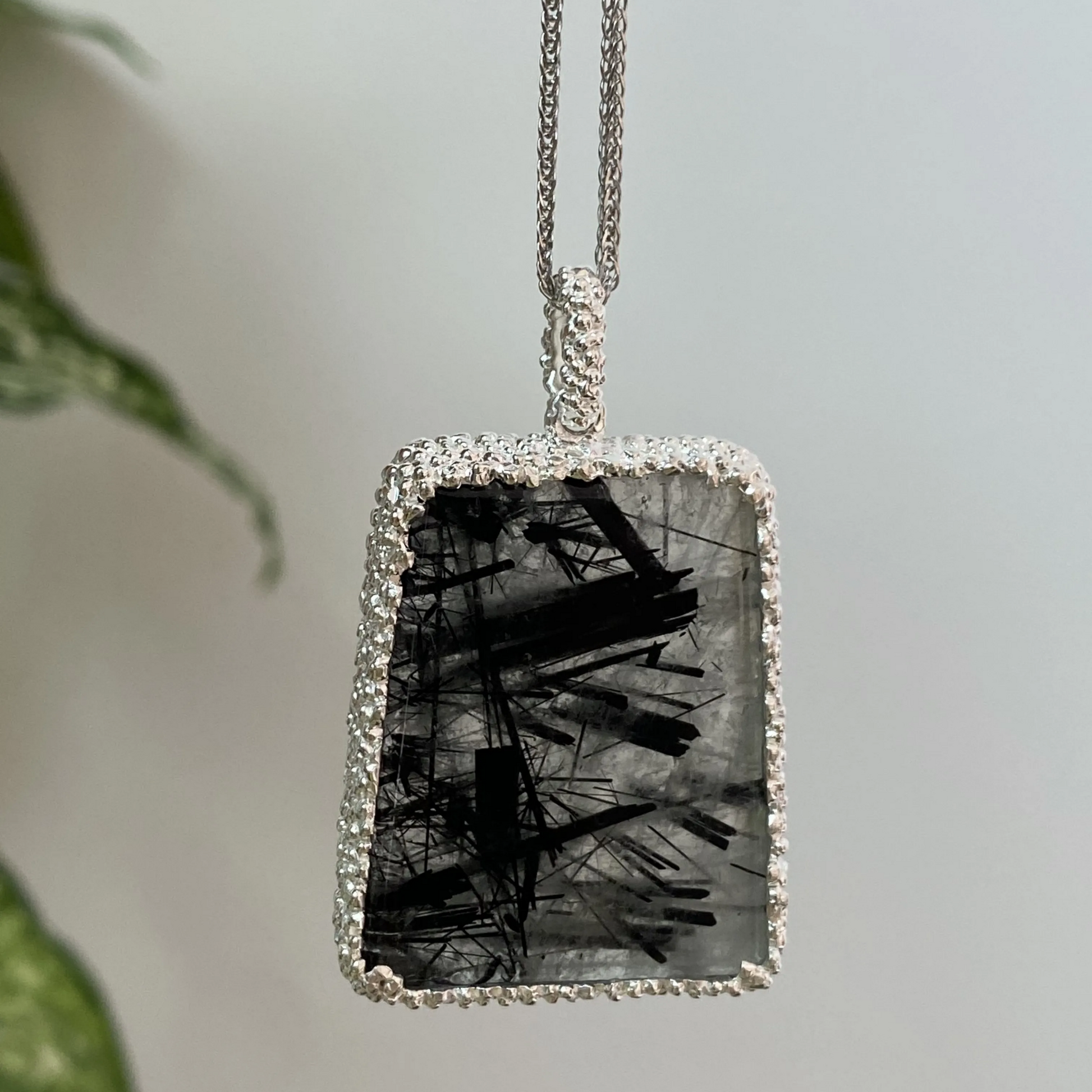 This handcrafted pendant features natural rutile quartz, also known as black tourmalinated quartz, set in 925 sterling silver.
