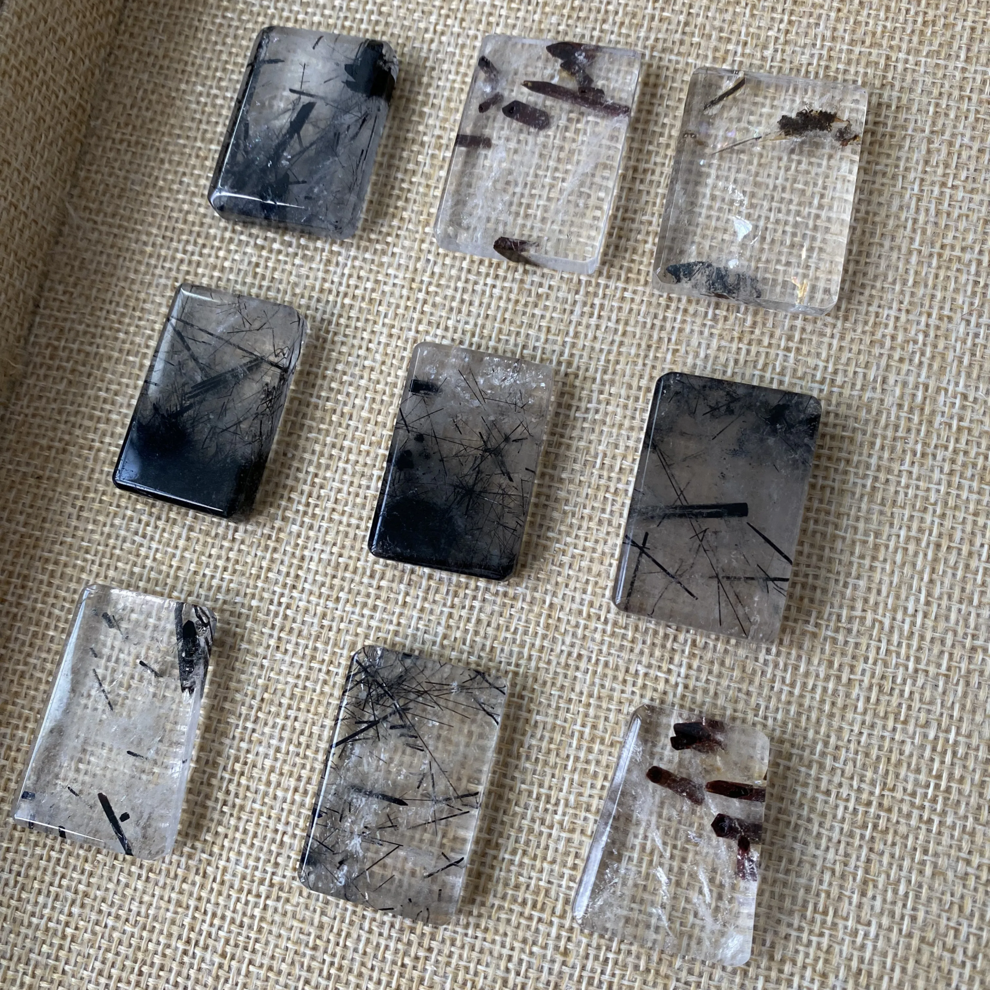 Each piece carries unique needle-like crystal inclusions — symbols of clarity, transformation, and grounded energy.