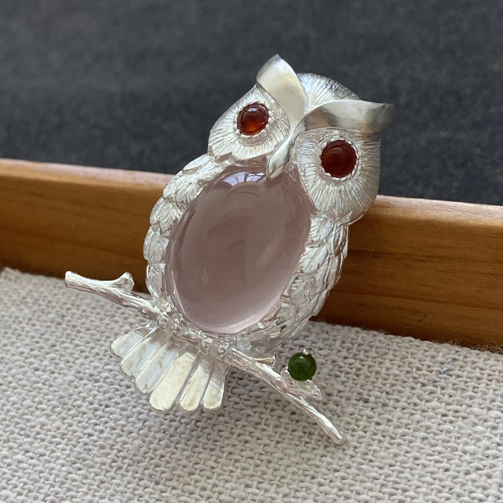 This Owl Brooch Pendant is handcrafted in 925 sterling silver, featuring a soft rose quartz center, vivid red garnet eyes, and a small green gemstone accent.