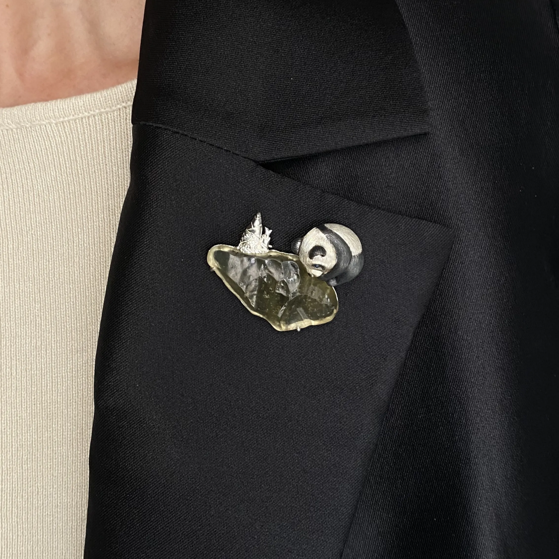 This Panda Brooch Pendant is handcrafted from 925 sterling silver with a base of natural glass, capturing the serene spirit of the forest.