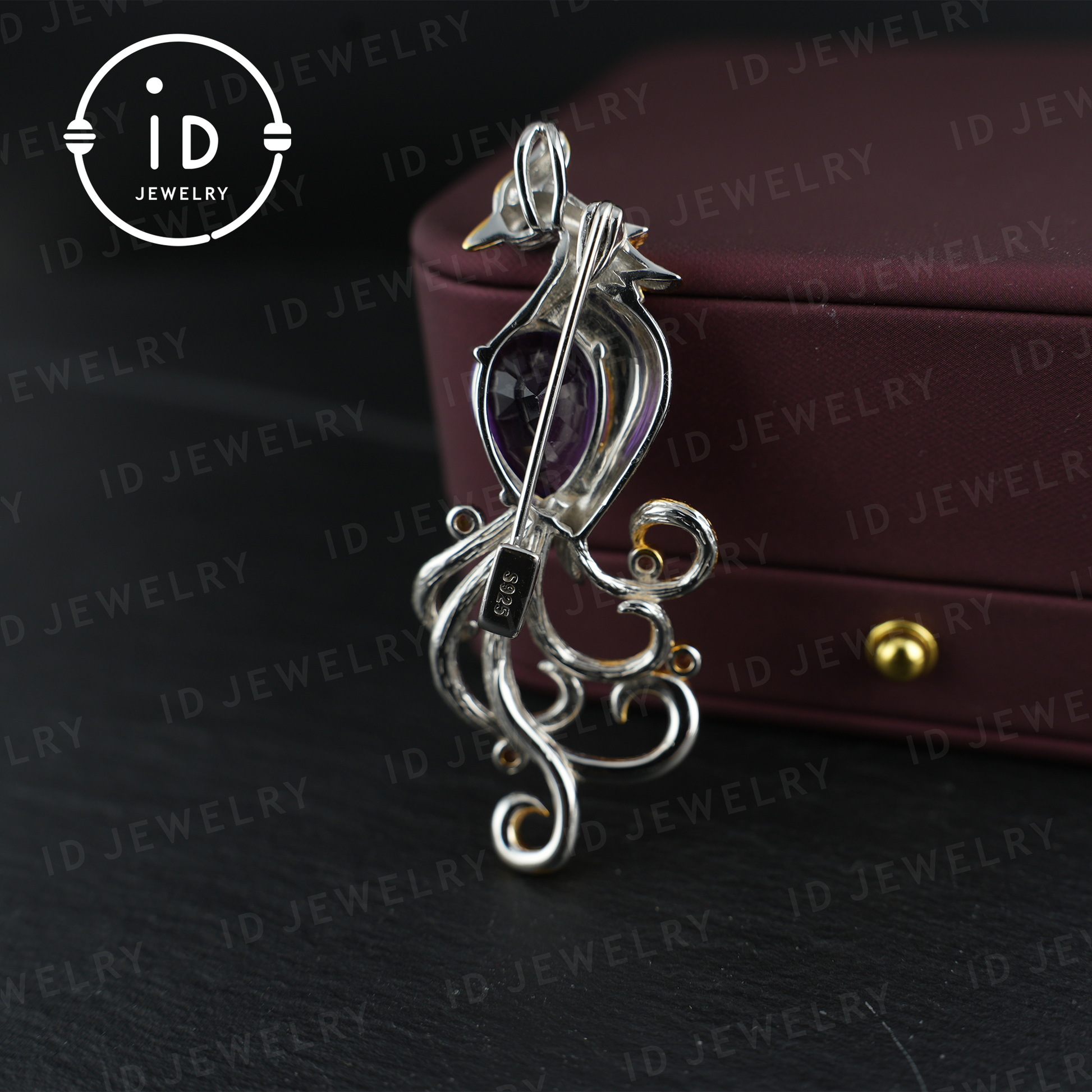 This exquisite brooch is crafted from high-quality sterling silver (925), elegantly finished with gold-plated 18K gold. The centerpiece is a stunning natural amethyst, artistically set in a phoenix-inspired design. The curved golden elements symbolize the mystical power and grace of the bird.