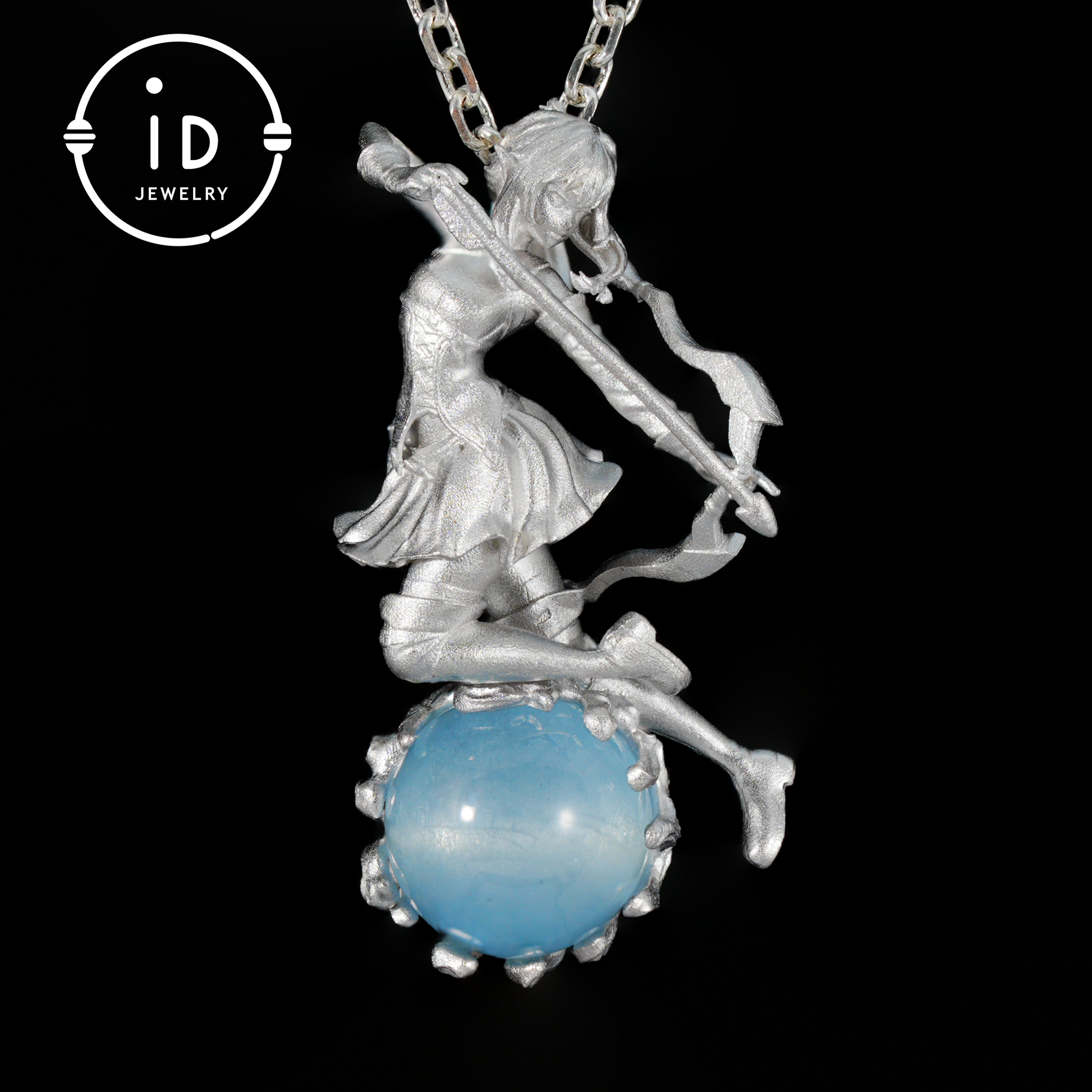 The silver archer is sculpted to express movement and tension, while the aquamarine is carefully selected for natural depth and light reflection.
