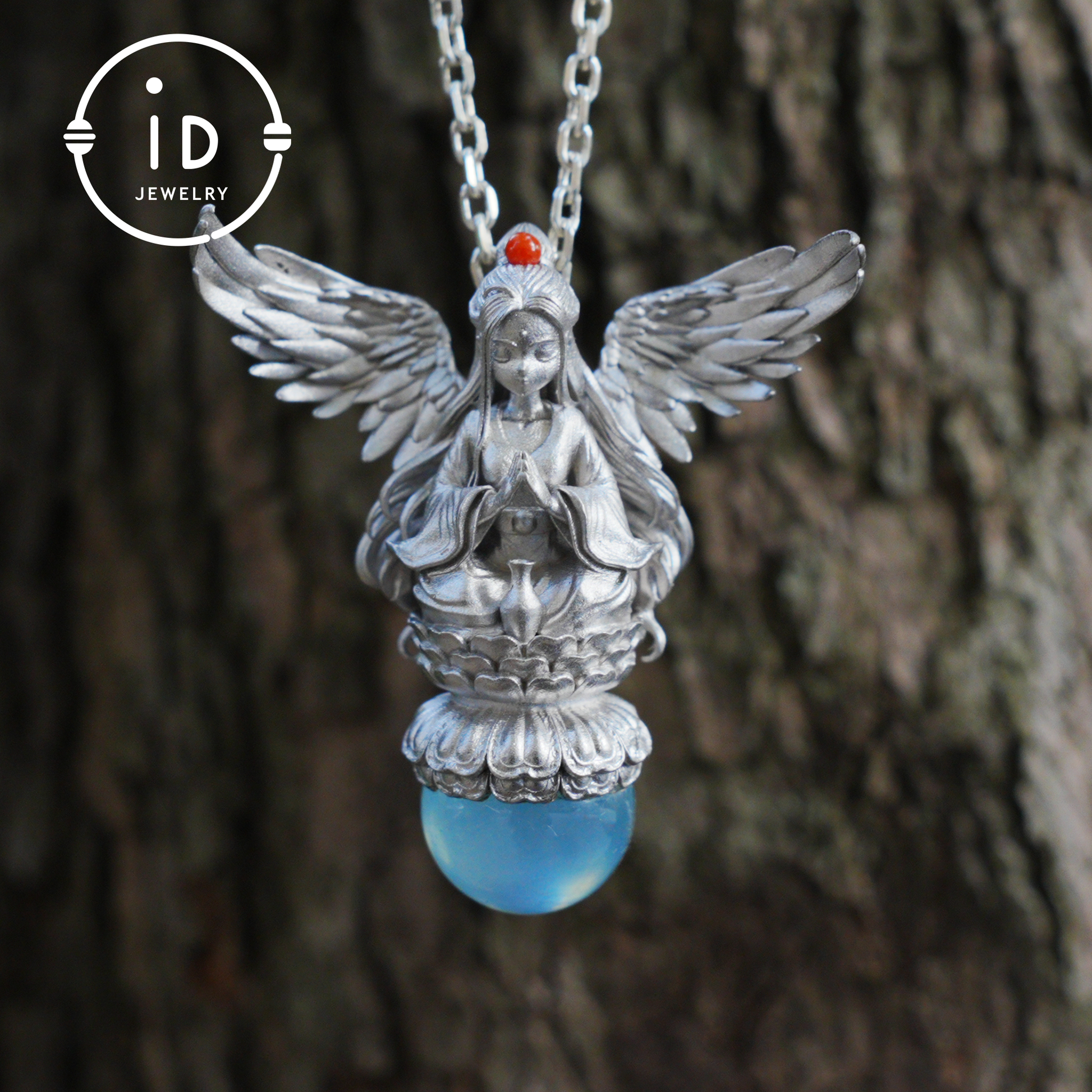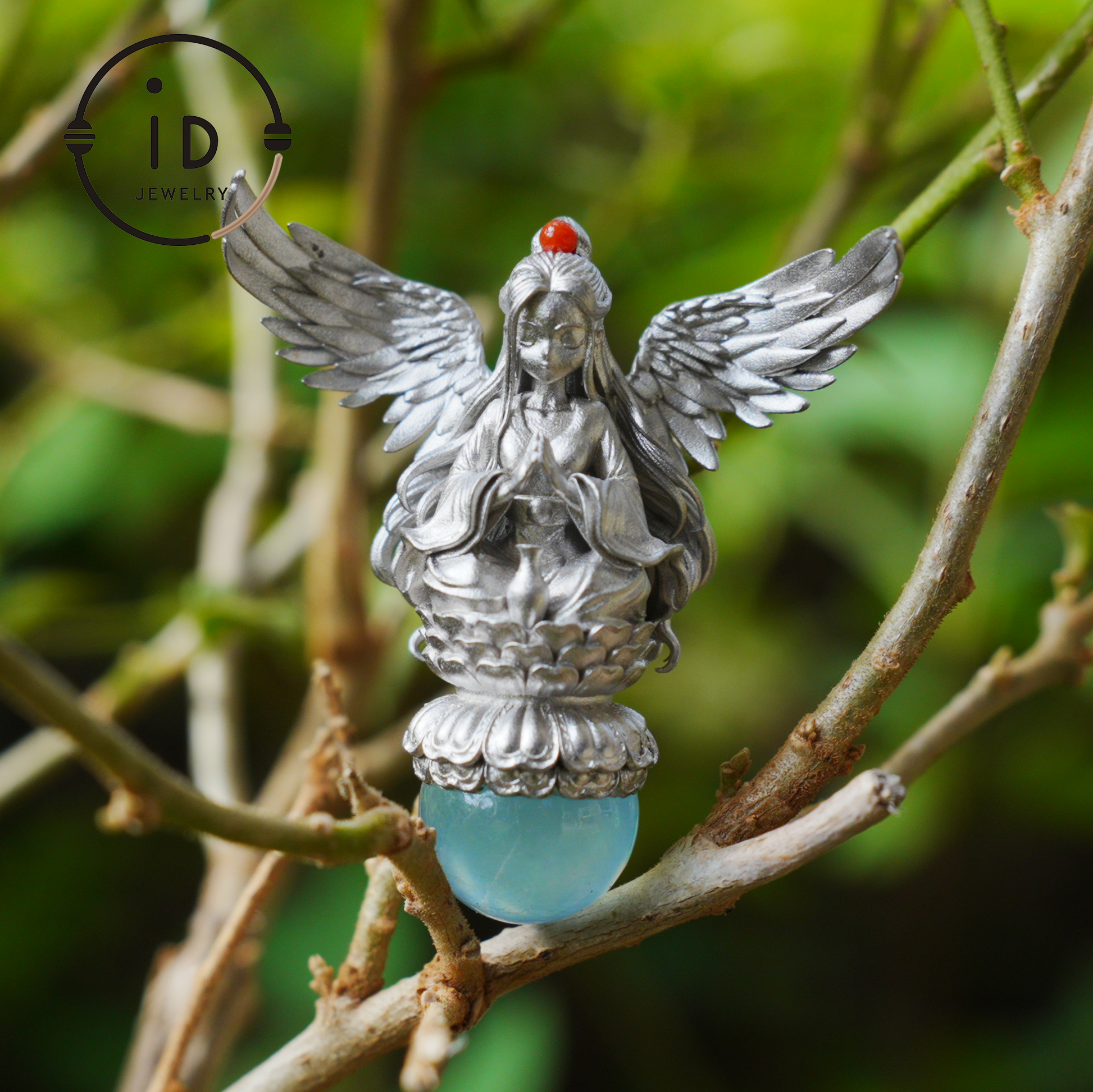 Its wings symbolize openness and connection, the calm figure represents balance and inner alignment, the aquamarine stands for clarity and soothing energy, and the red agate embodies gentle determination.