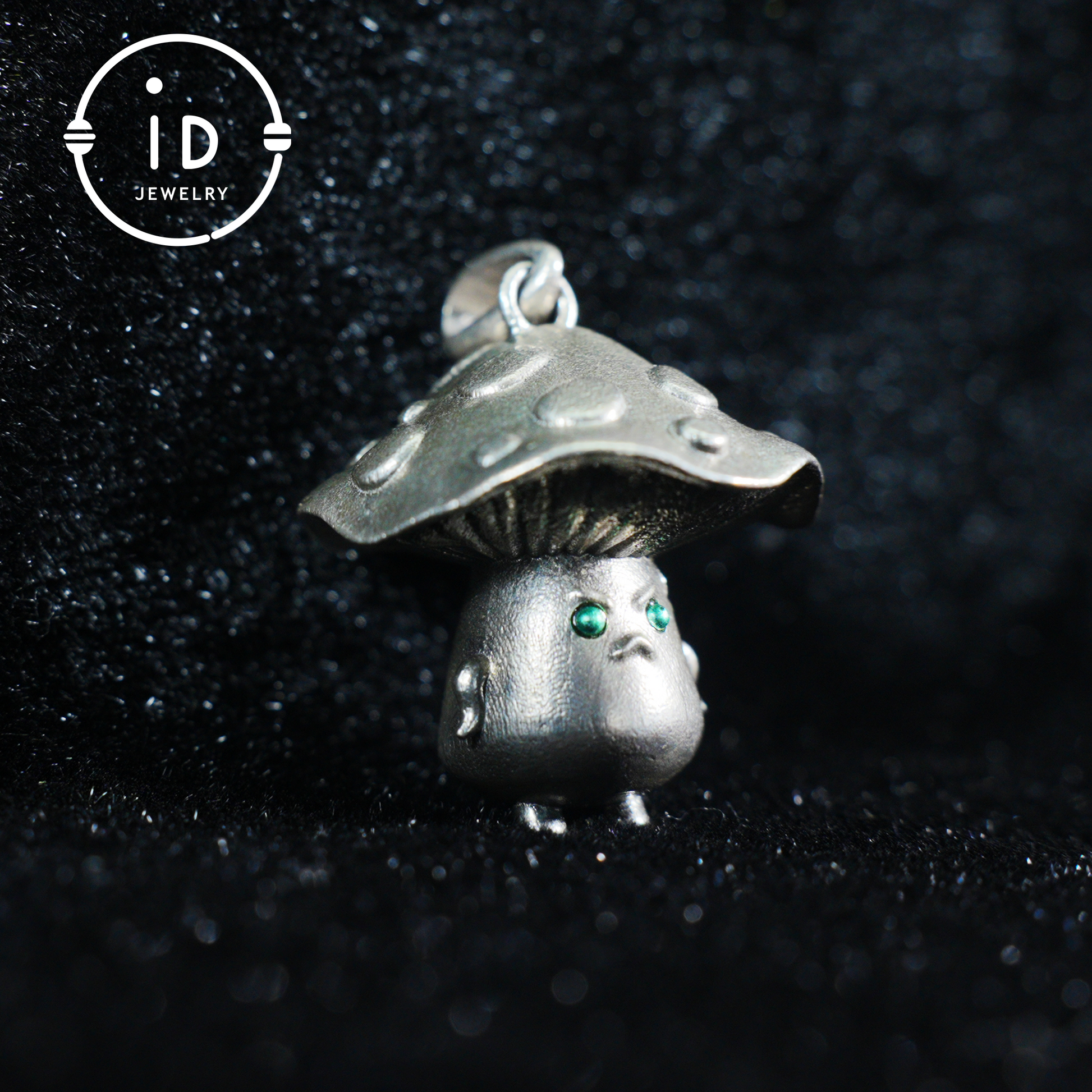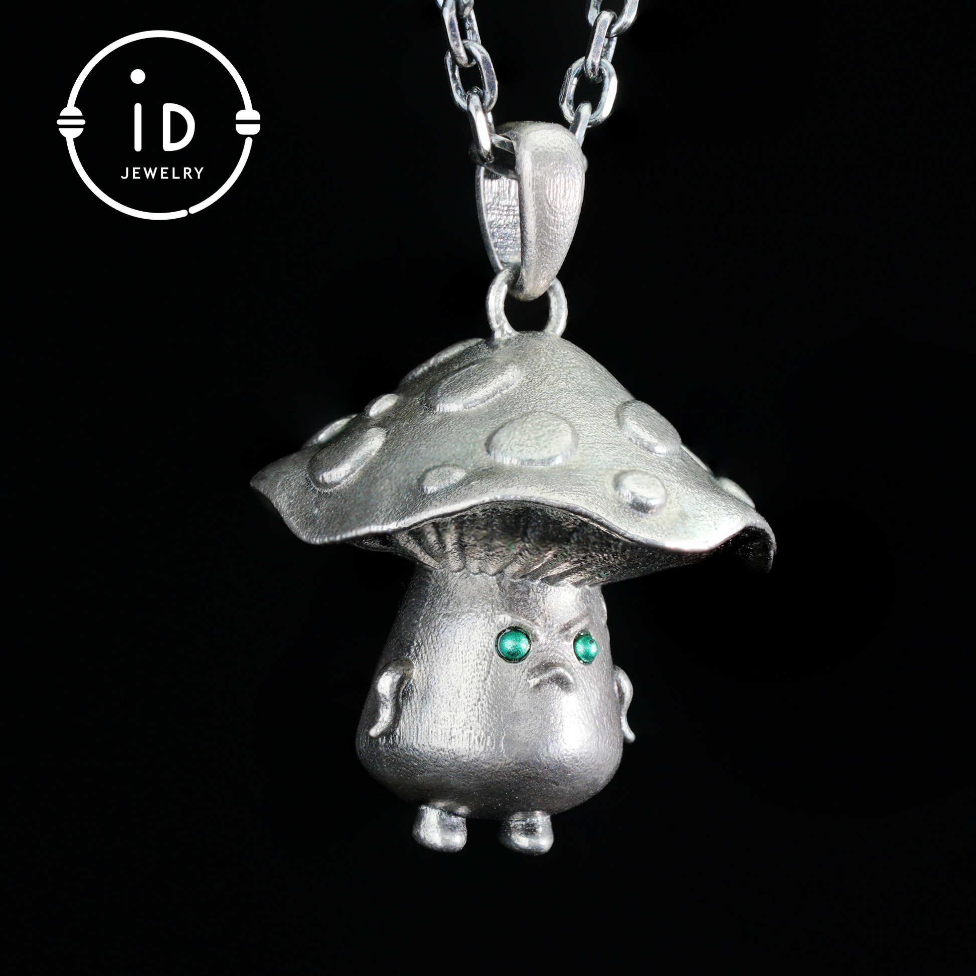 Sterling Silver Mushroom Pendant with Green Gem Eyes – Fantasy Forest Creature Necklace – Cute Emotional Support Jewelry Gift