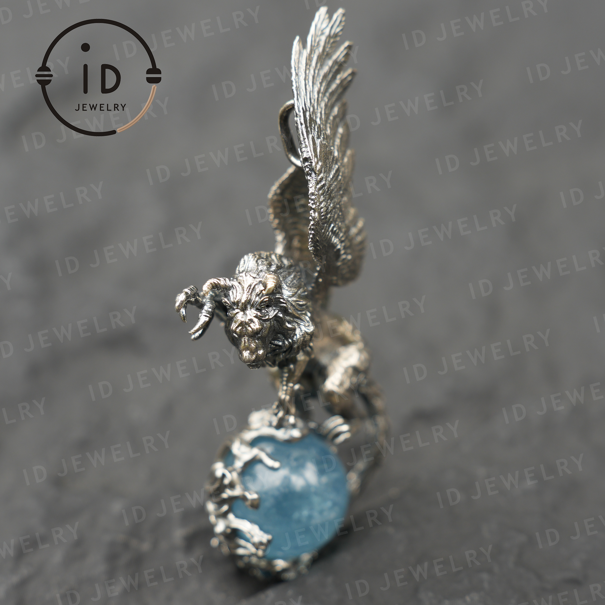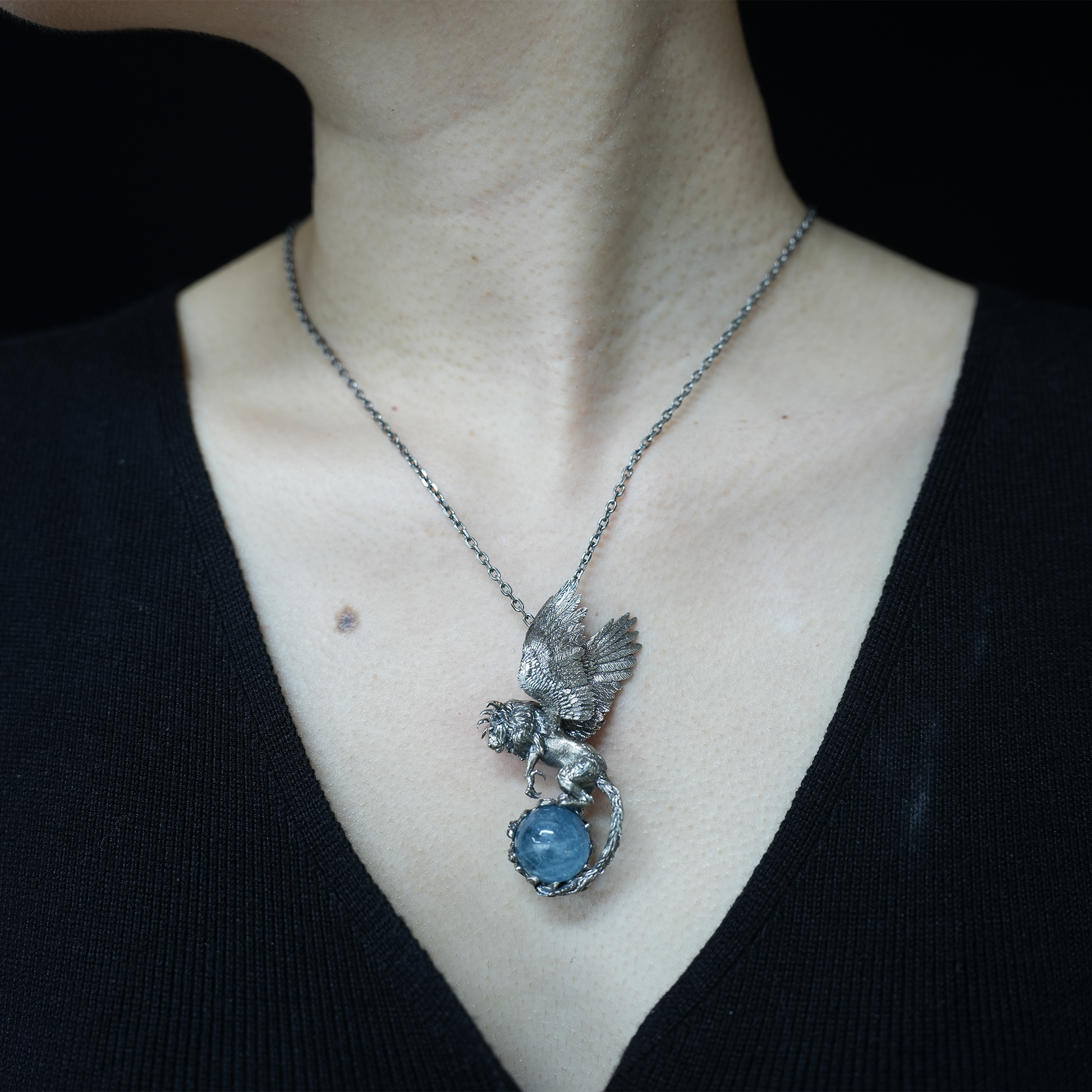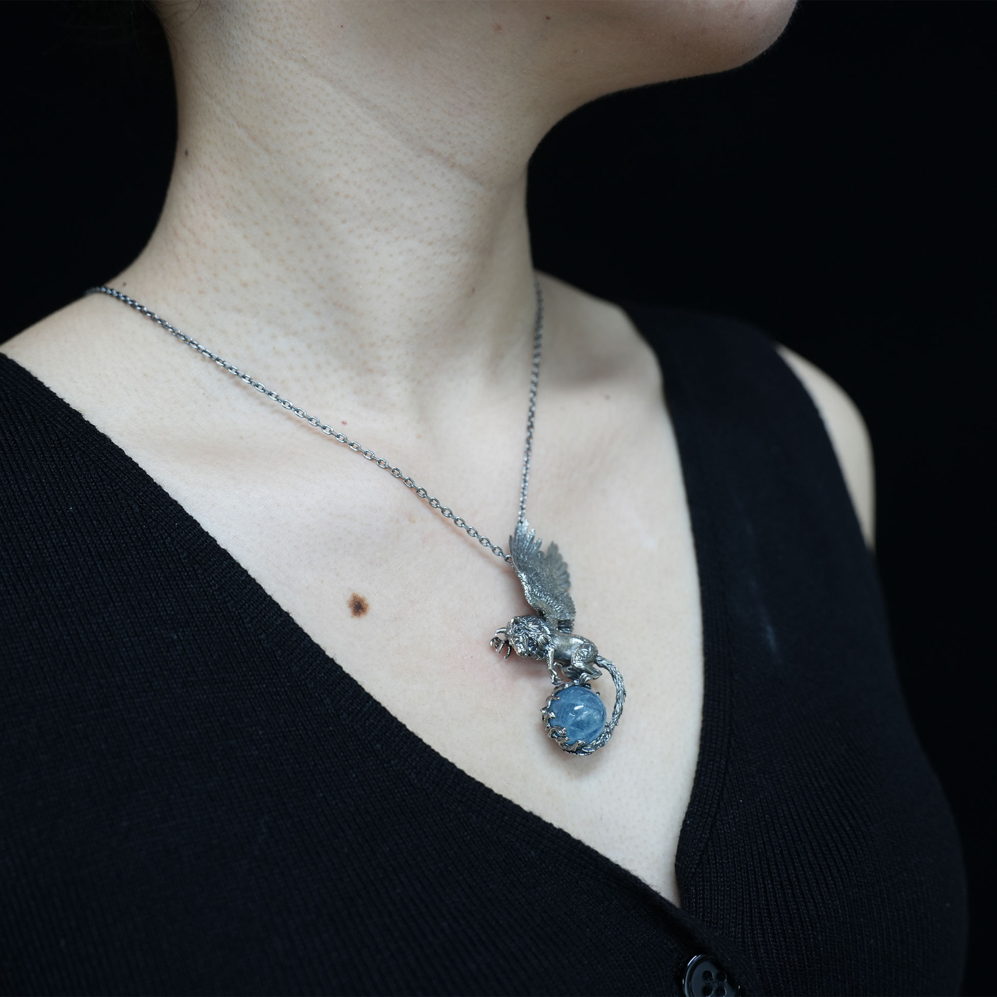 Winged Lion Pendant - Handcrafted 925 Sterling Silver Jewelry with Aquamarine - Symbol of Wisdom & Spiritual Protection - Gift for Her